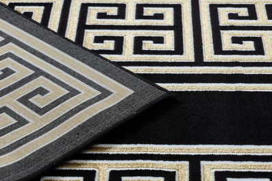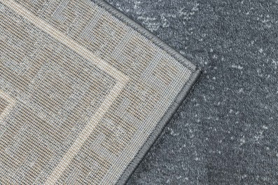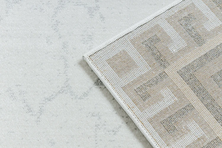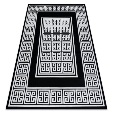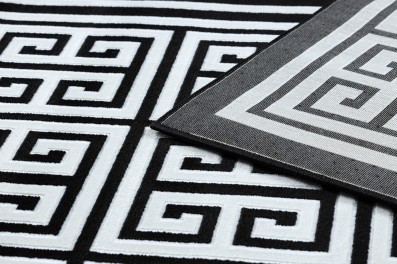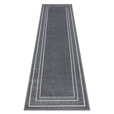 Szary dywan z klasycznym wzorem greckiego klucza i białą ramką, który idealnie wypełni korytarz, nadając mu elegancki charakter.