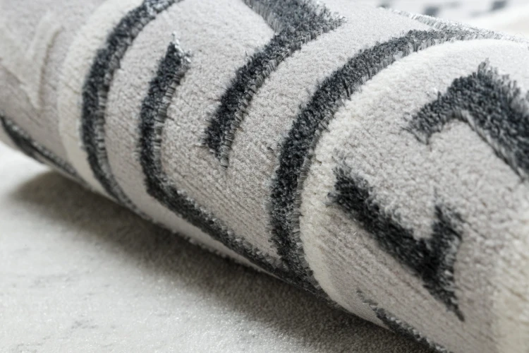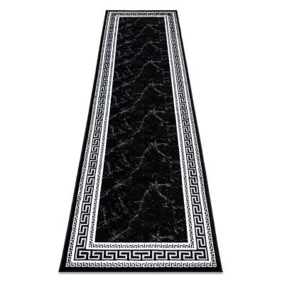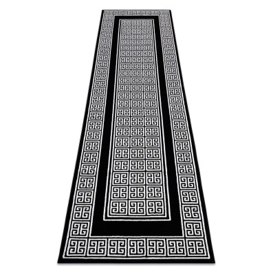 Szary dywan z klasycznym wzorem greckiego klucza i białą ramką, który idealnie wypełni korytarz, nadając mu elegancki charakter.
