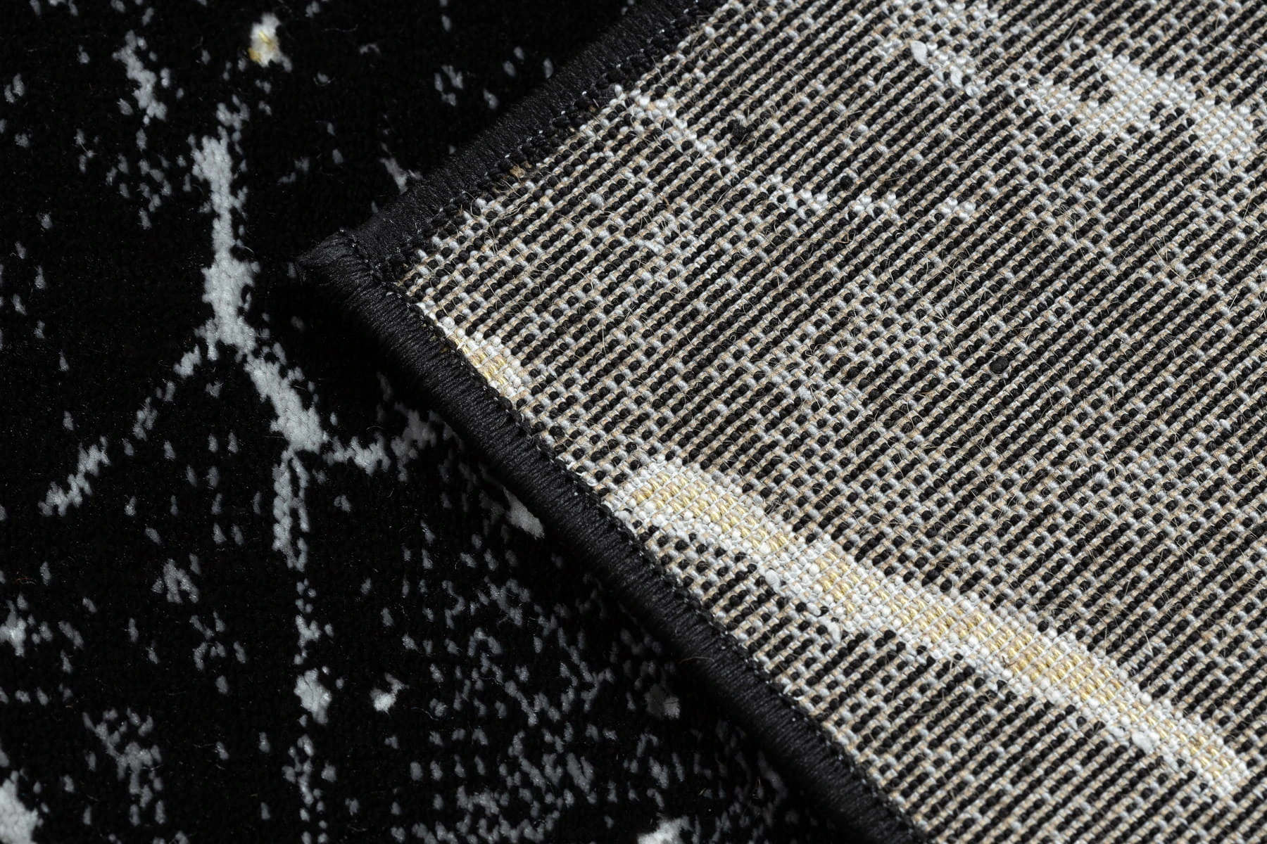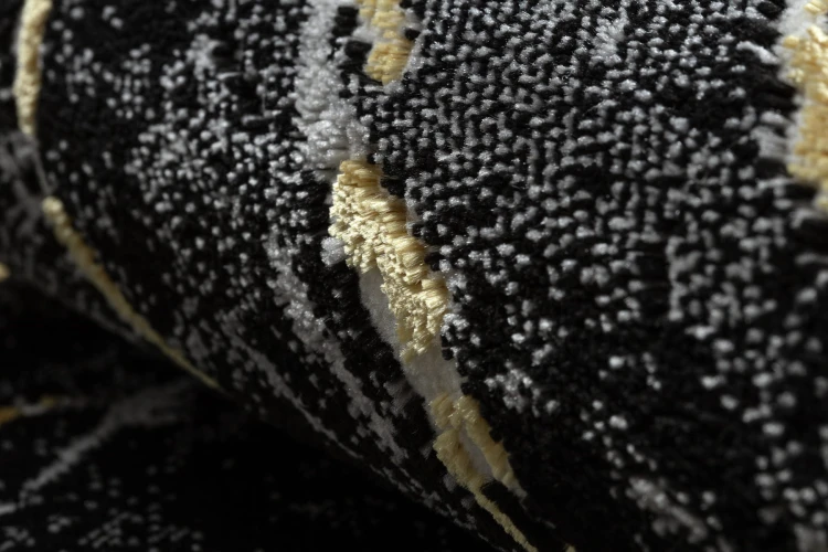 Czarno-złoty dywan z abstrakcyjnym wzorem, który nadaje korytarzom elegancki, nowoczesny charakter.