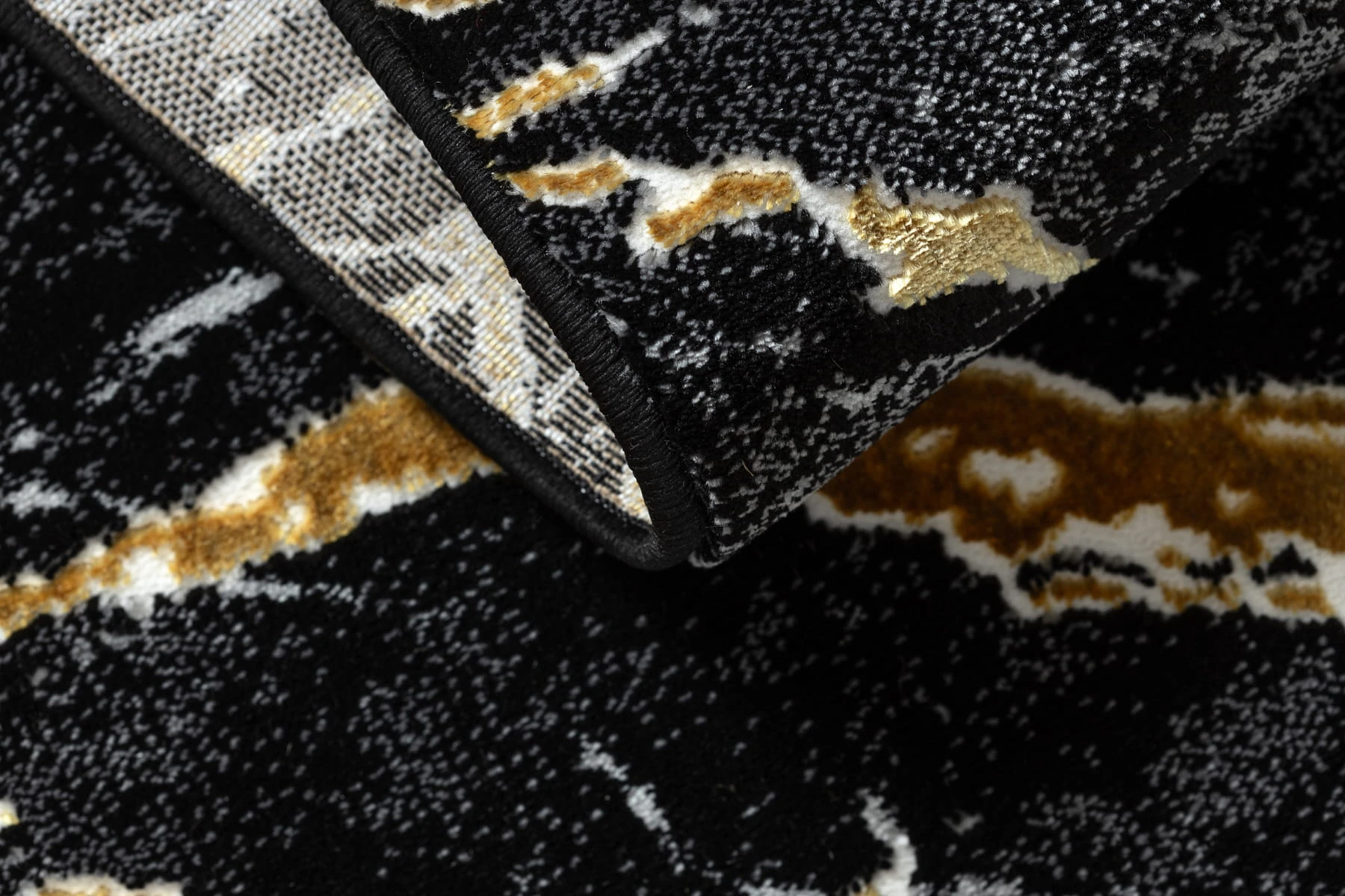 Czarno-złoty dywan z abstrakcyjnym wzorem, który nadaje korytarzom elegancki, nowoczesny charakter.