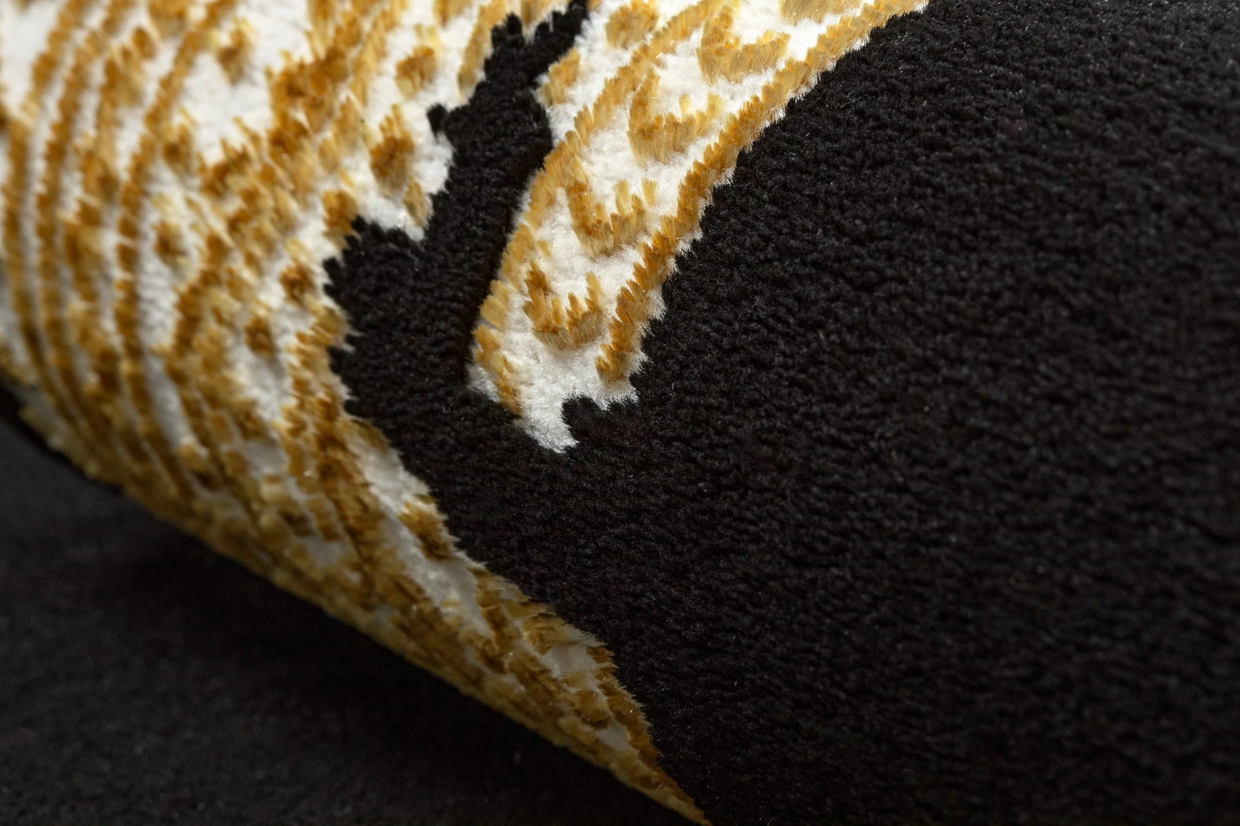 Złoty dywan z elegancką ramką, który nadaje korytarzowi ciepły, luksusowy charakter i doskonale wypełnia długie przejścia.