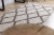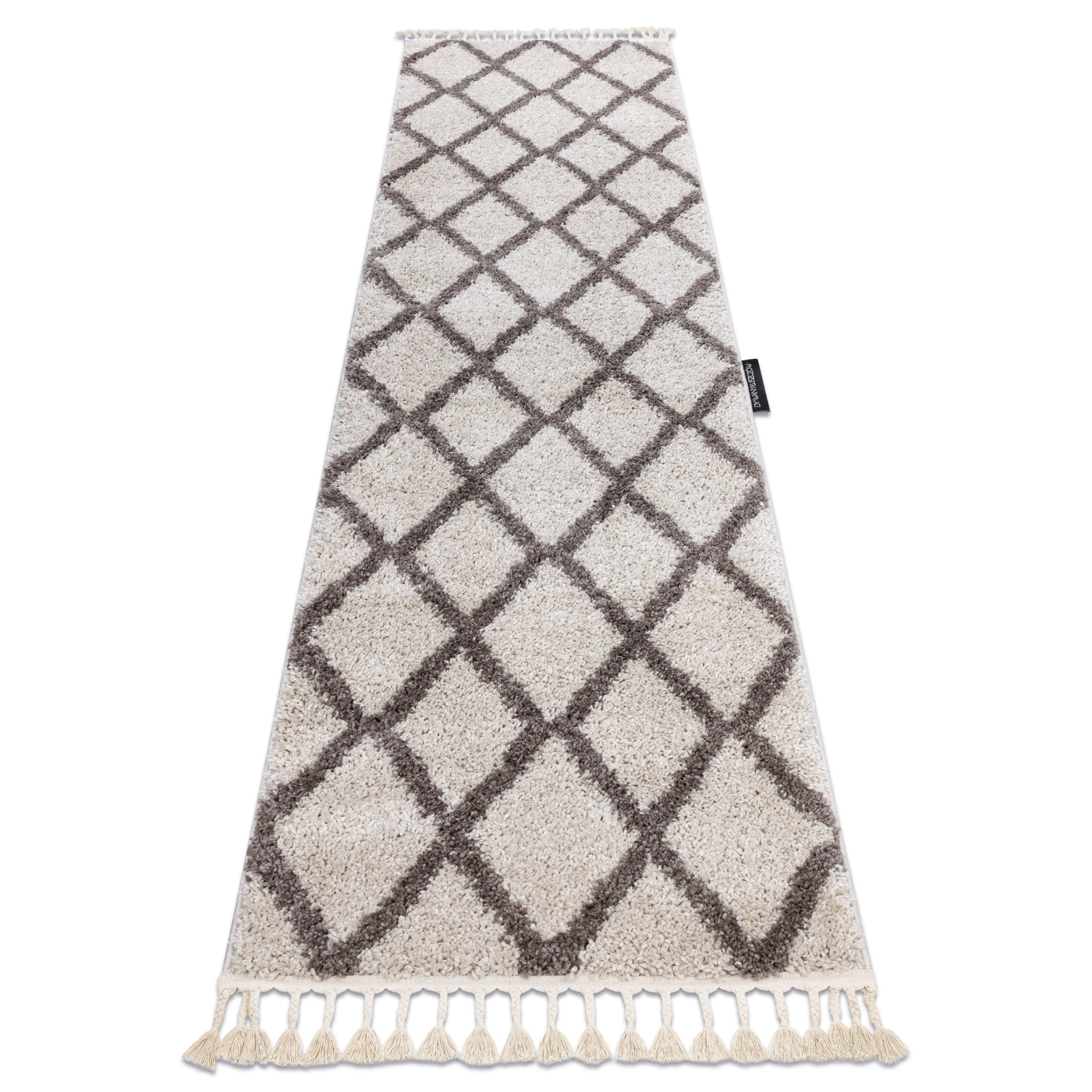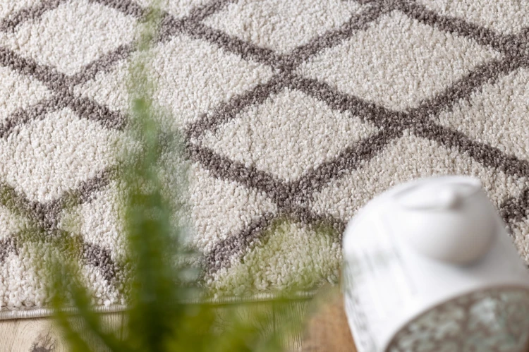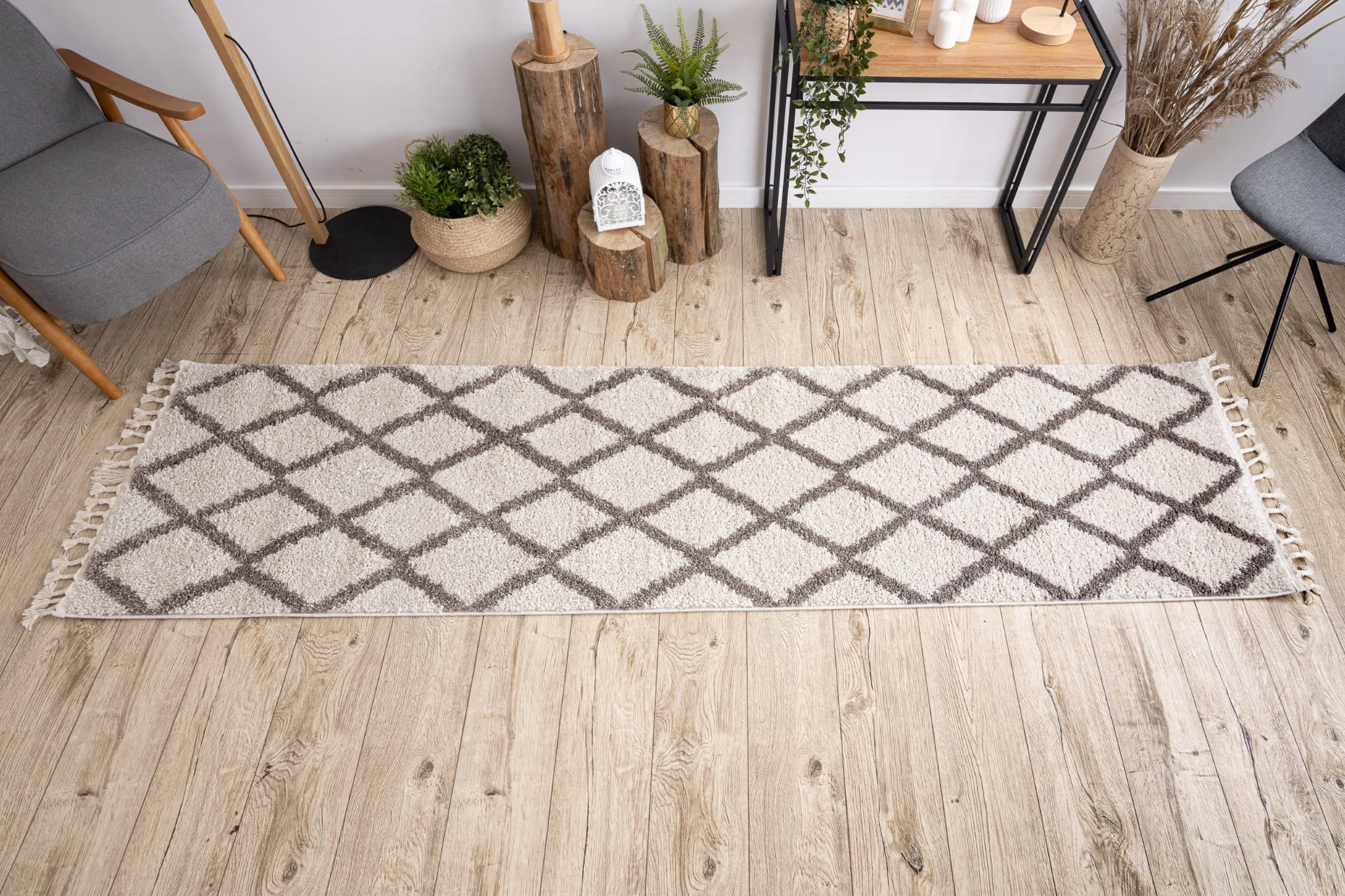 Kremowy dywan z geometrycznym wzorem, który doskonale wypełni długi korytarz, nadając mu elegancki i uporządkowany charakter.