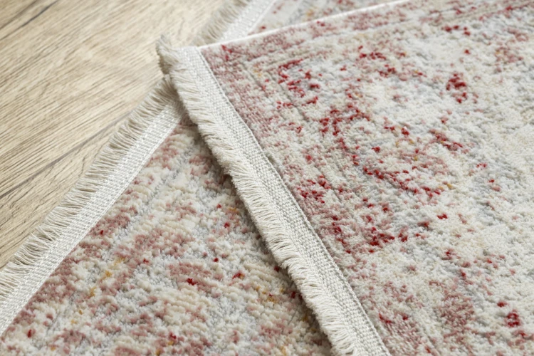 Różowy dywan z abstrakcyjnym wzorem, który ożywi długi korytarz delikatnym, kobiecym akcentem.