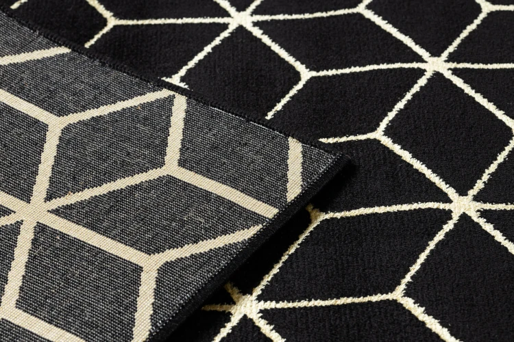 Czarno-złoty dywan z geometrycznym wzorem sześcianów, który doda korytarzowi elegancki, nowoczesny charakter.