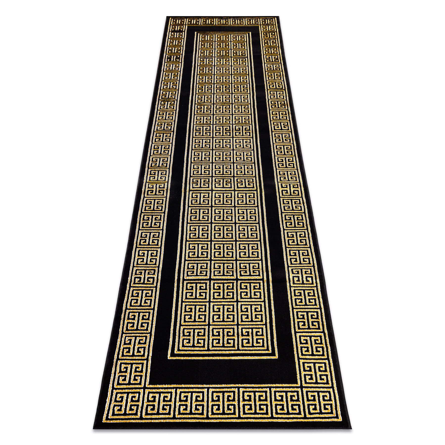 Czarno-złoty dywan z grecką ramką, który nada korytarzowi elegancki, klasyczny charakter.