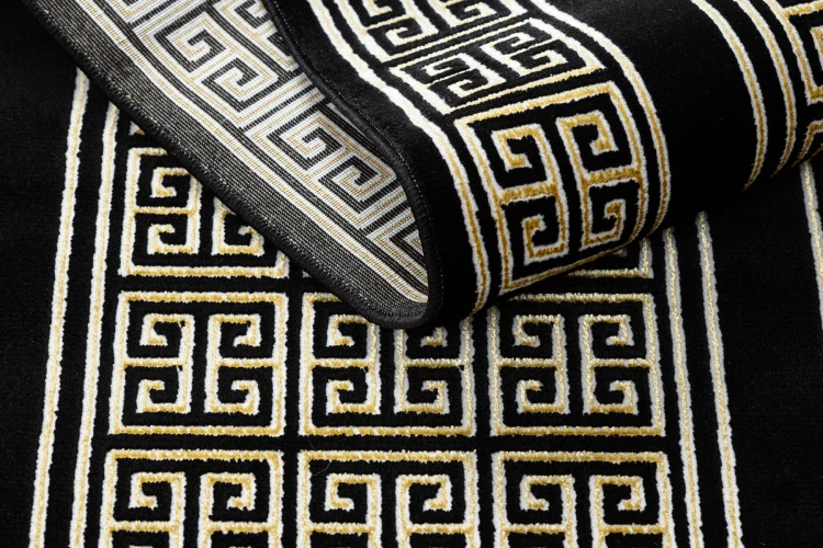 Czarno-złoty dywan z grecką ramką, który nada korytarzowi elegancki, klasyczny charakter.