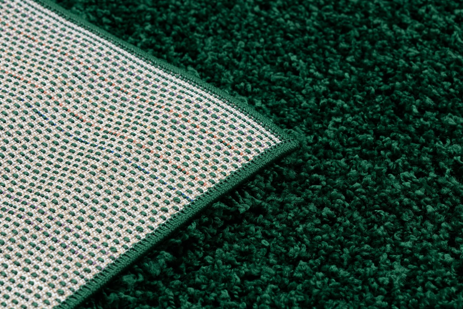 Jednokolorowy dywan shaggy w butelkowej zieleni z runem 50 mm, który nada korytarzowi elegancki charakter i stworzy przyjemną atmosferę w całym domu.