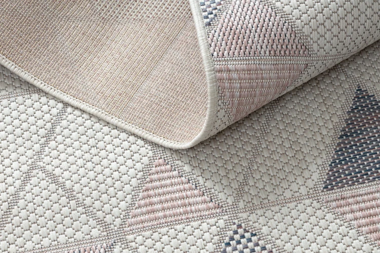 Kremowy dywan z geometrycznym wzorem trójkątów w odcieniu róży, który idealnie sprawdzi się w korytarzu, dodając mu nowoczesnego charakteru.