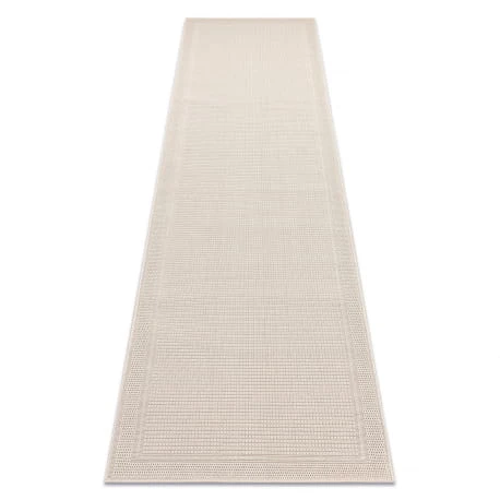 Beżowy chodnik o sznurkowej fakturze sizalu z elegancką ramką, idealny do korytarzy, gdzie stworzy naturalną i stonowaną atmosferę.