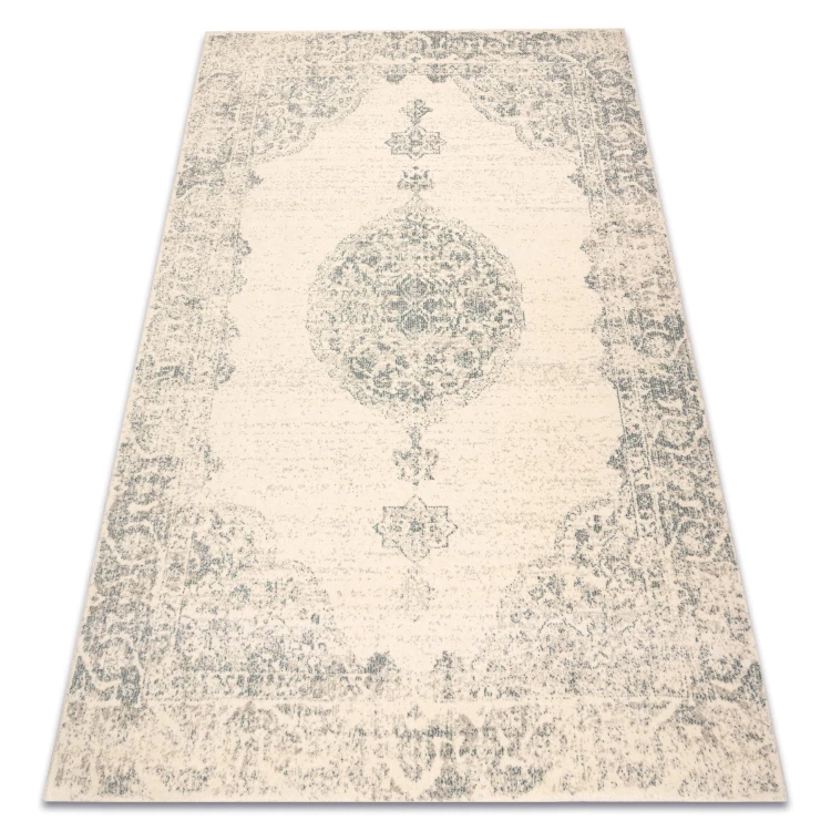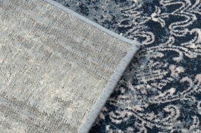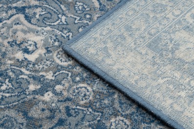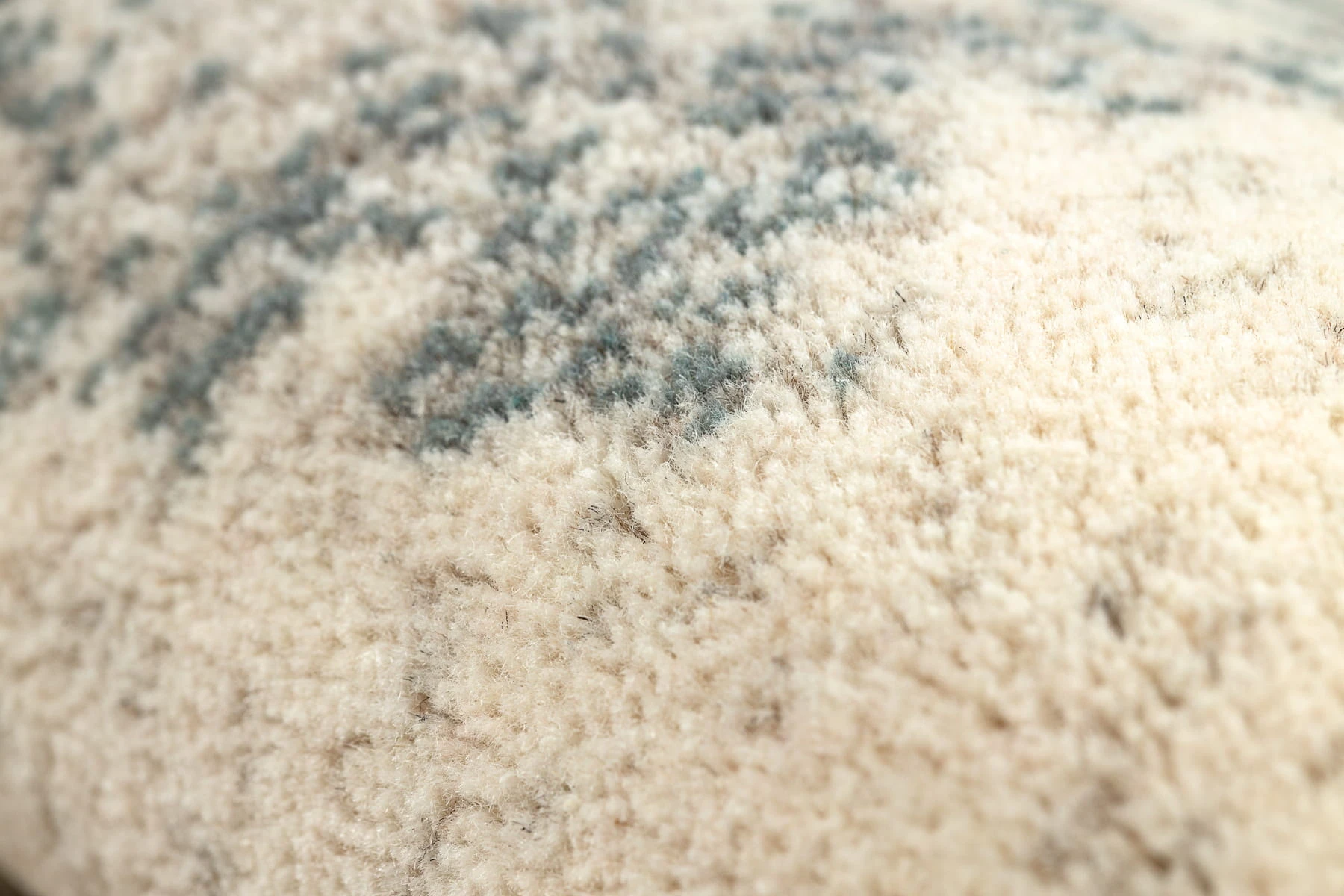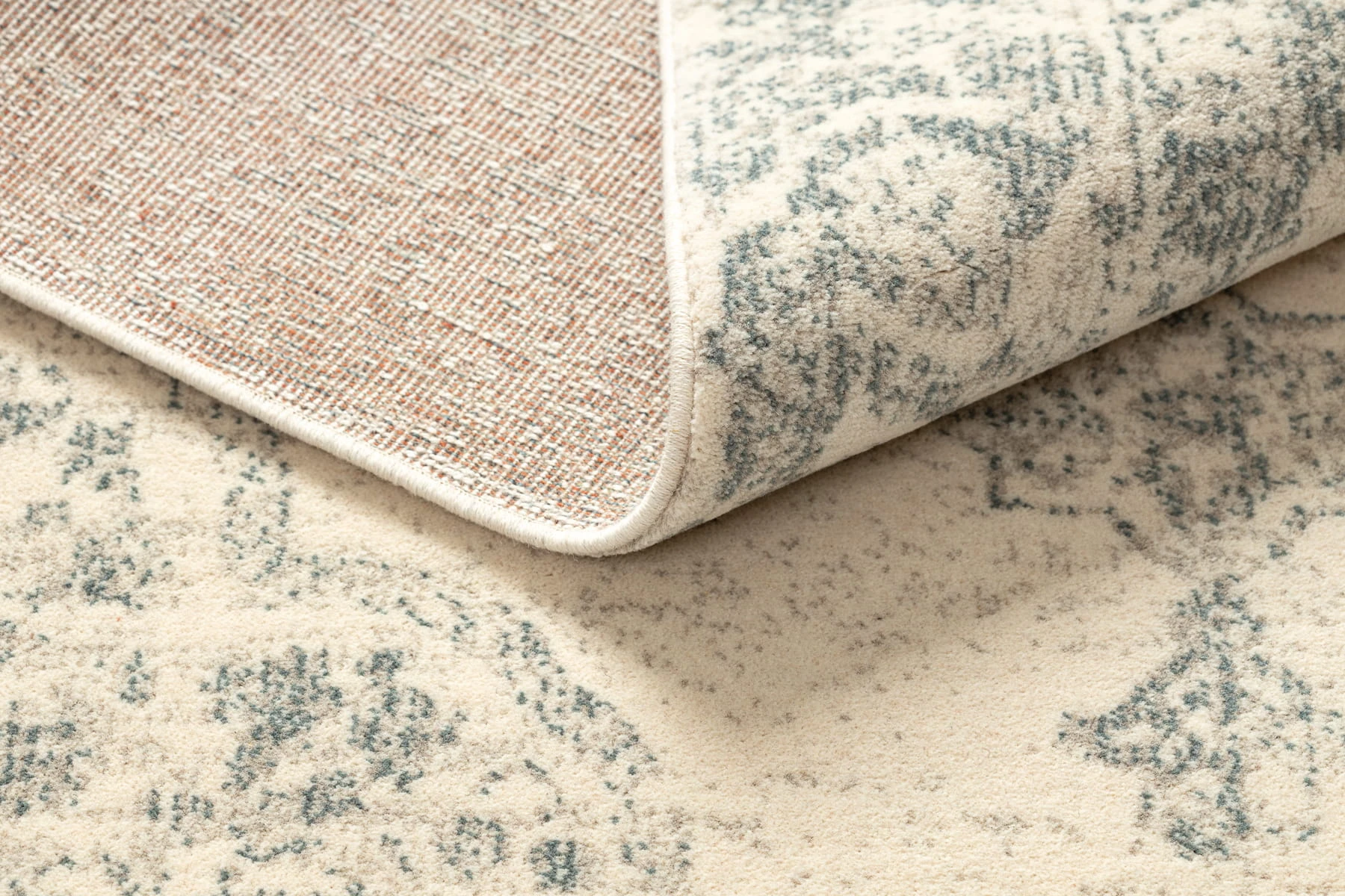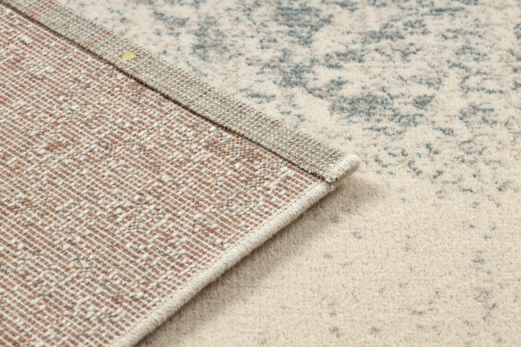 Beżowy dywan z abstrakcyjnym wzorem w niebieskich akcentach, który wprowadzi do salonu elegancki i spokojny charakter.
