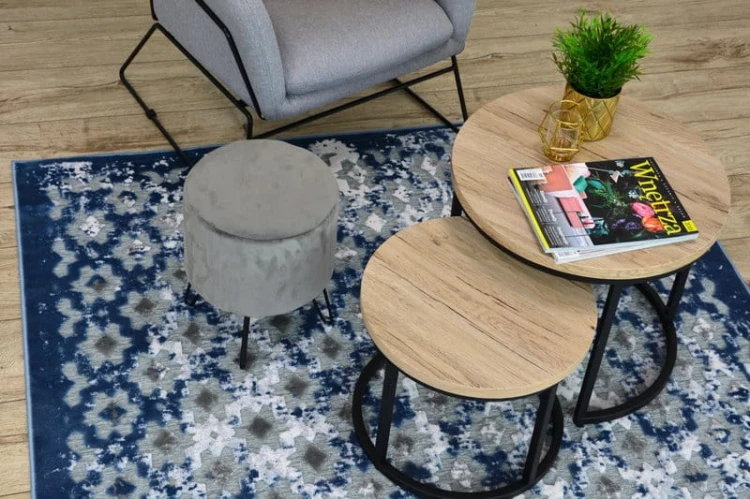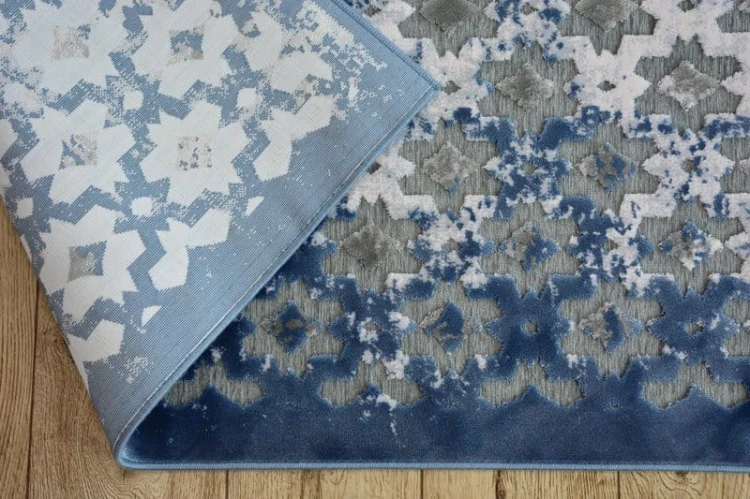 Szaro-niebieski dywan z abstrakcyjnym wzorem, który doskonale sprawdzi się w salonie, dodając wnętrzu nowoczesny charakter.