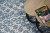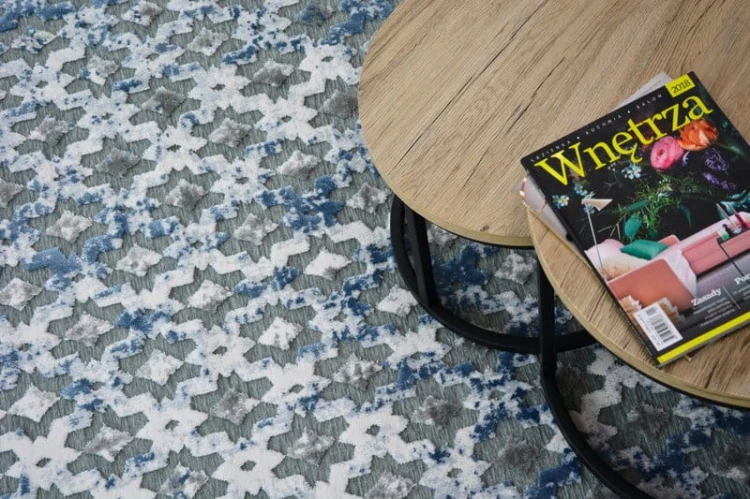 Dywan w odcieniach szarości i błękitu z abstrakcyjnym wzorem, który nada korytarzowi nowoczesny charakter i wprowadzi spokojne, harmonijne kolory.