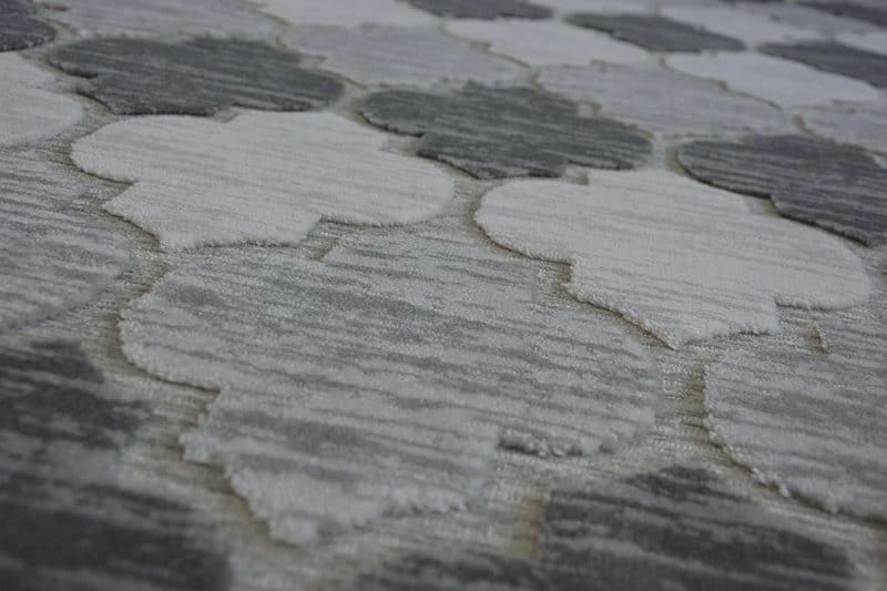 Szary dywan z geometrycznym wzorem, który doskonale sprawdzi się w korytarzu, nadając mu nowoczesny charakter.