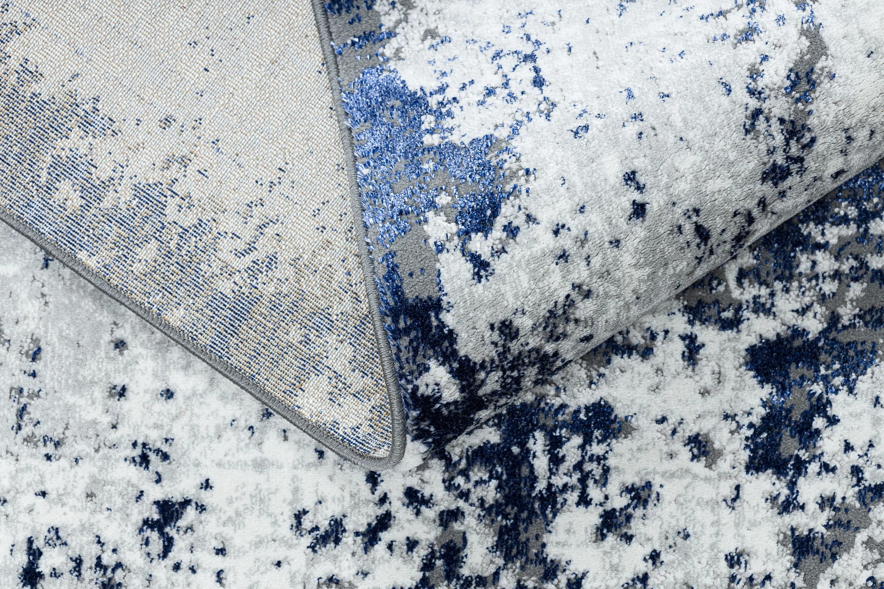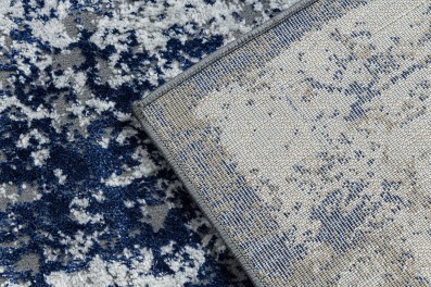 Granatowo-biały dywan z abstrakcyjnym wzorem, który doskonale wpisze się w nowoczesny salon lub pokój.