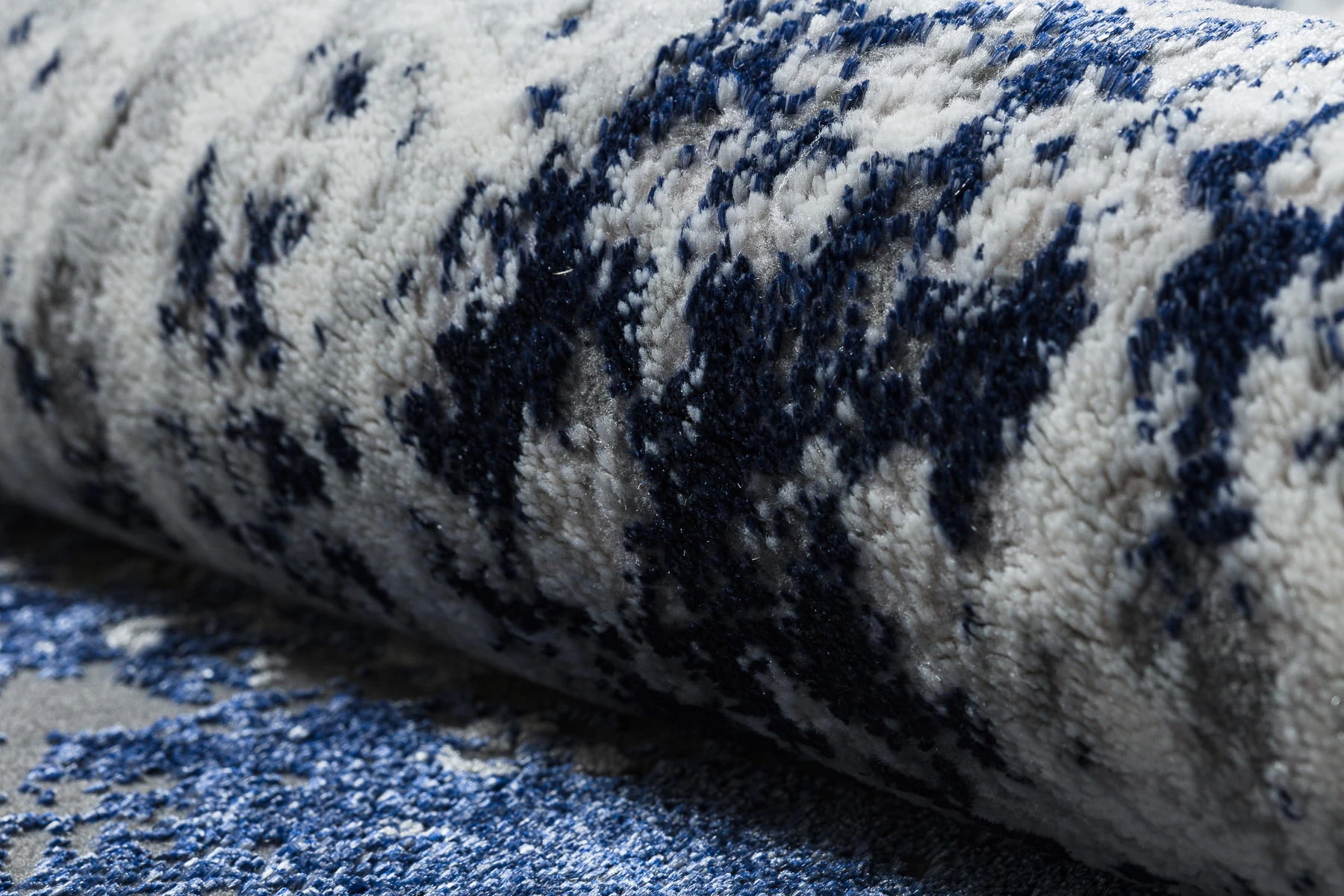 Granatowo-biały dywan z abstrakcyjnym wzorem, który doskonale wpisze się w nowoczesny salon lub pokój.