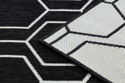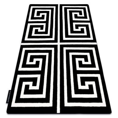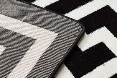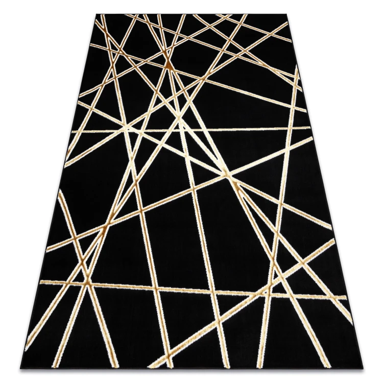 Czarno-złoty dywan z geometrycznym wzorem, który doda salonowi eleganckiego charakteru i nowoczesnego stylu.
