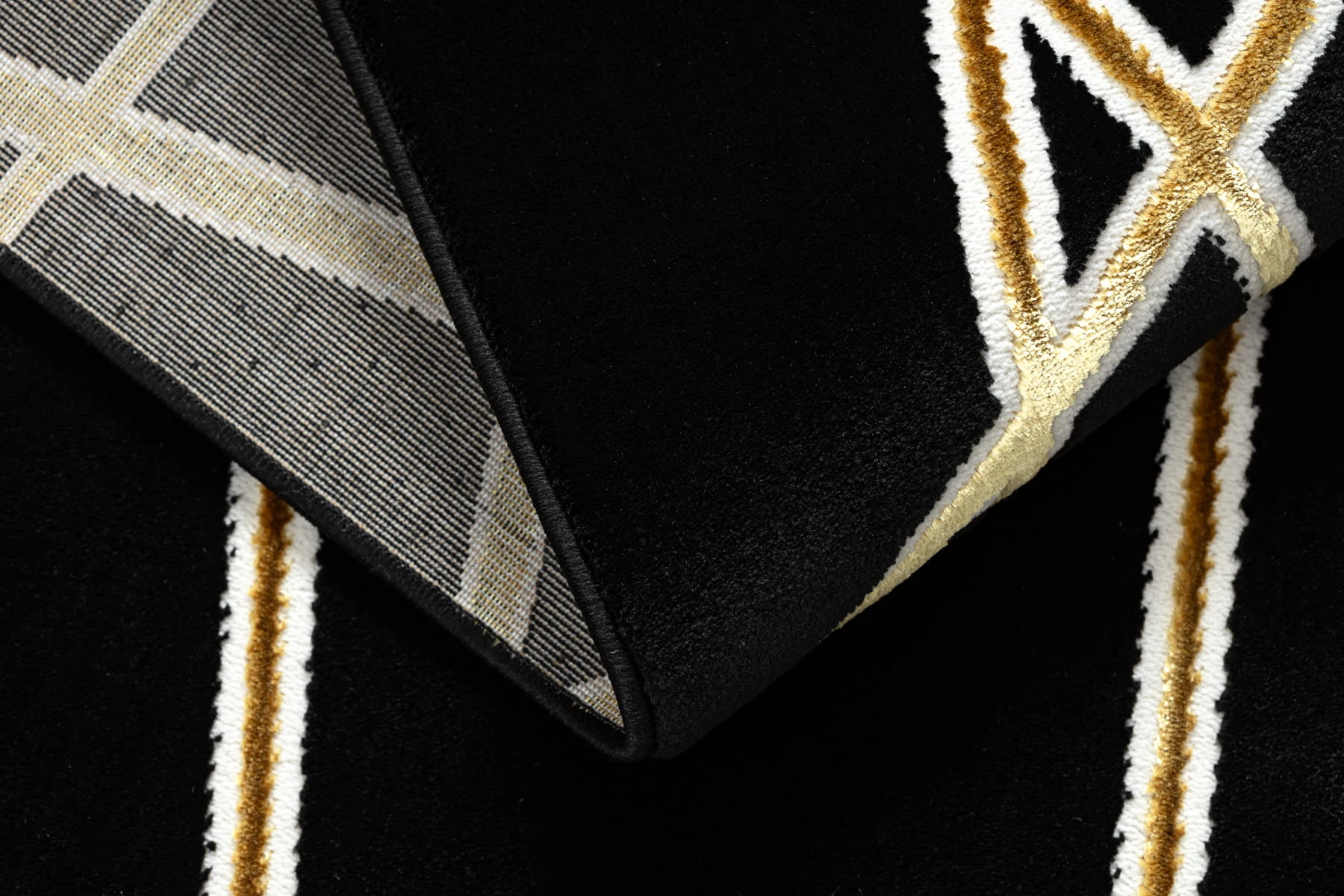 Czarno-złoty dywan z geometrycznym wzorem, który doda salonowi eleganckiego charakteru i nowoczesnego stylu.