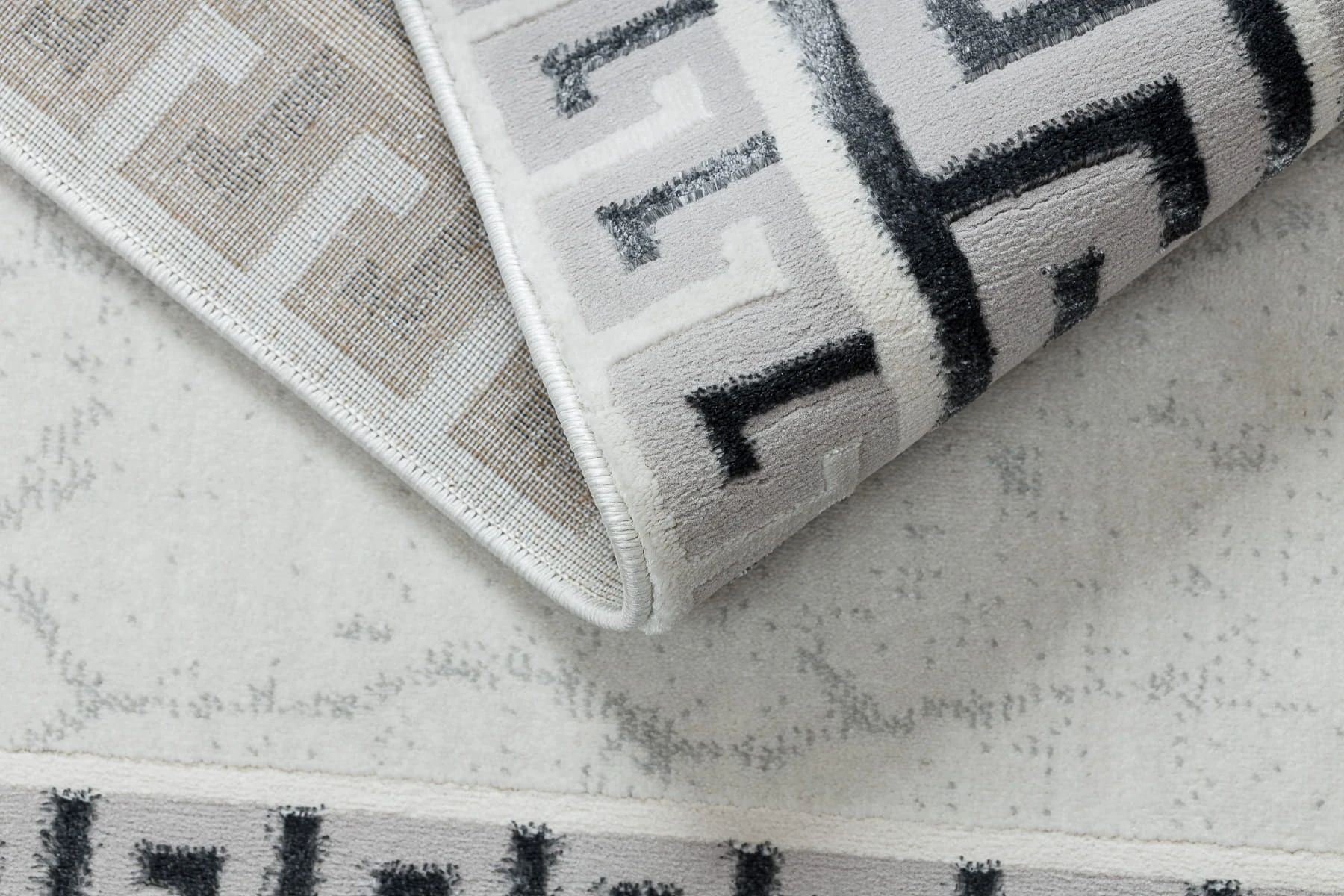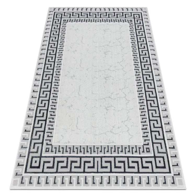 Szary dywan z klasycznym wzorem greckiego klucza i białą ramką, który idealnie wypełni korytarz, nadając mu elegancki charakter.
