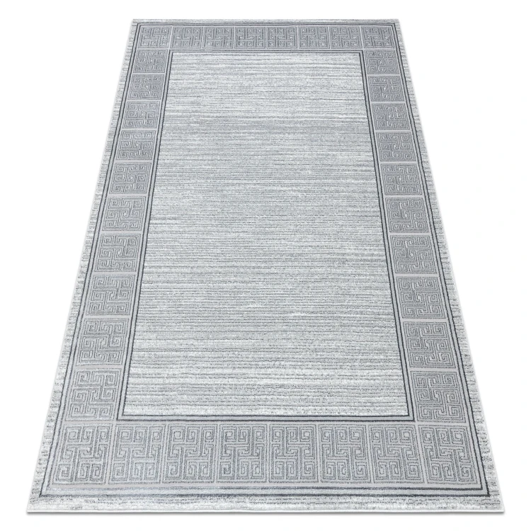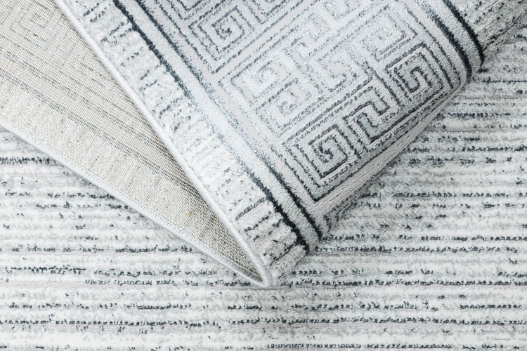Szaro-biały dywan z klasycznym wzorem greckiego klucza w ramce, który nada salonowi elegancki, ponadczasowy charakter.