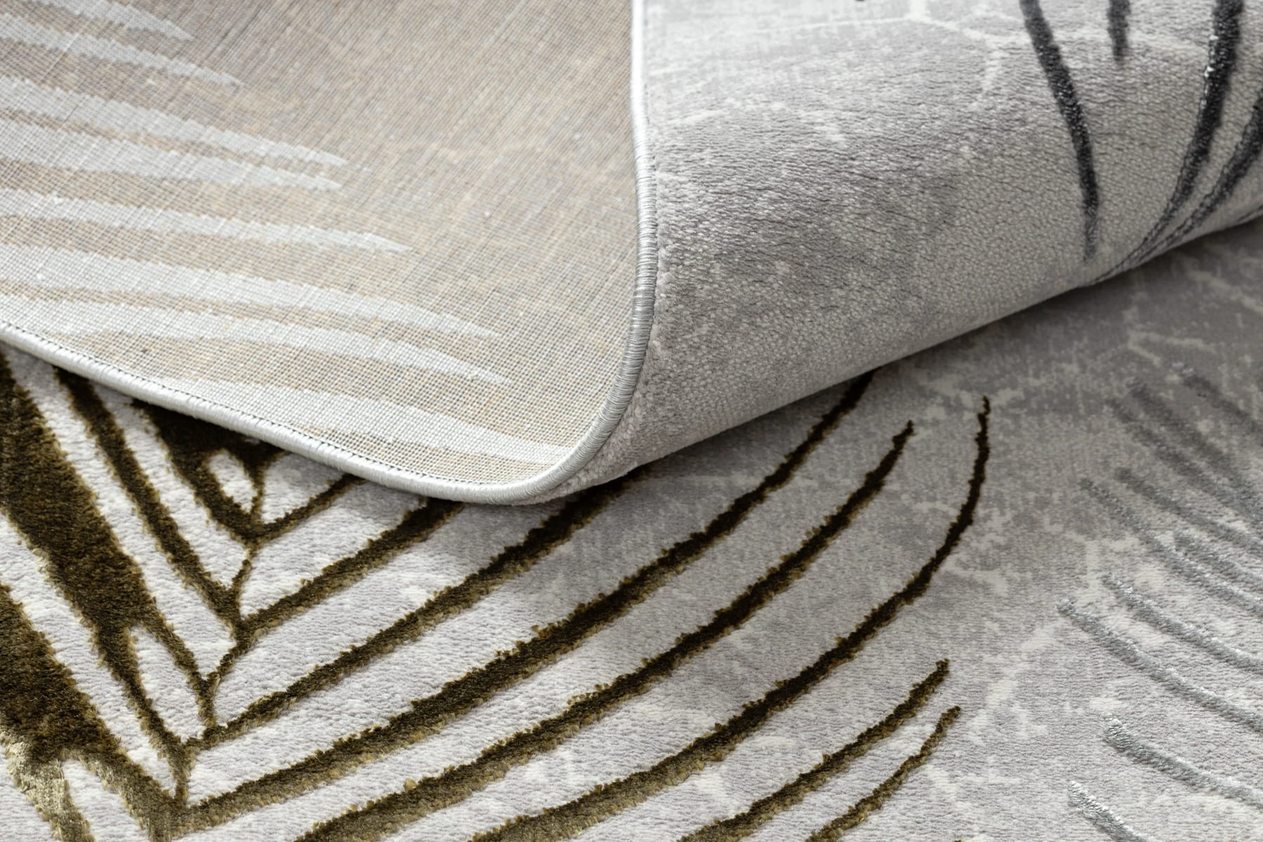 Szaro-złoty dywan z roślinnym motywem liści palmy, który wprowadzi do korytarza naturalny, elegancki akcent.