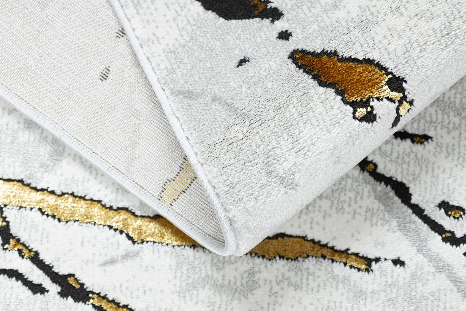Biało-złoty dywan z abstrakcyjnym wzorem marmurkowym, który wprowadzi elegancki akcent do salonu lub pokoju.