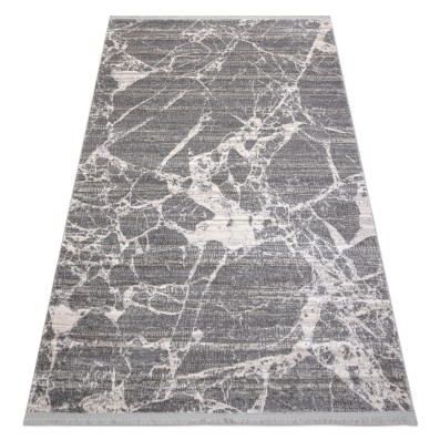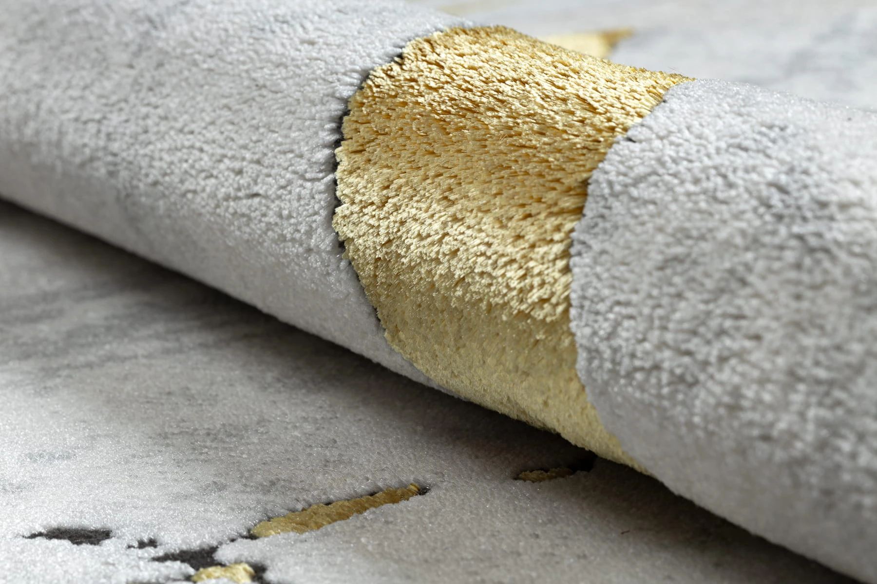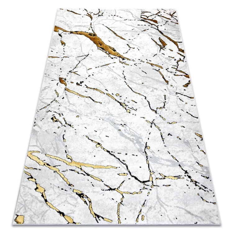 Biało-złoty dywan z abstrakcyjnym wzorem marmurkowym, który wprowadzi elegancki akcent do salonu lub pokoju.