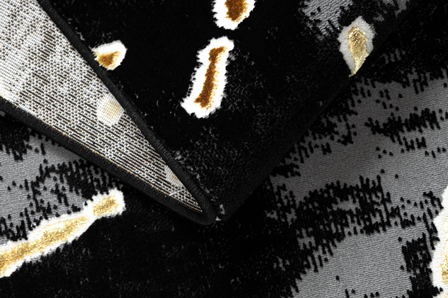 Czarno-złoty dywan z abstrakcyjnym wzorem, który nadaje salonowi elegancki i nowoczesny charakter.