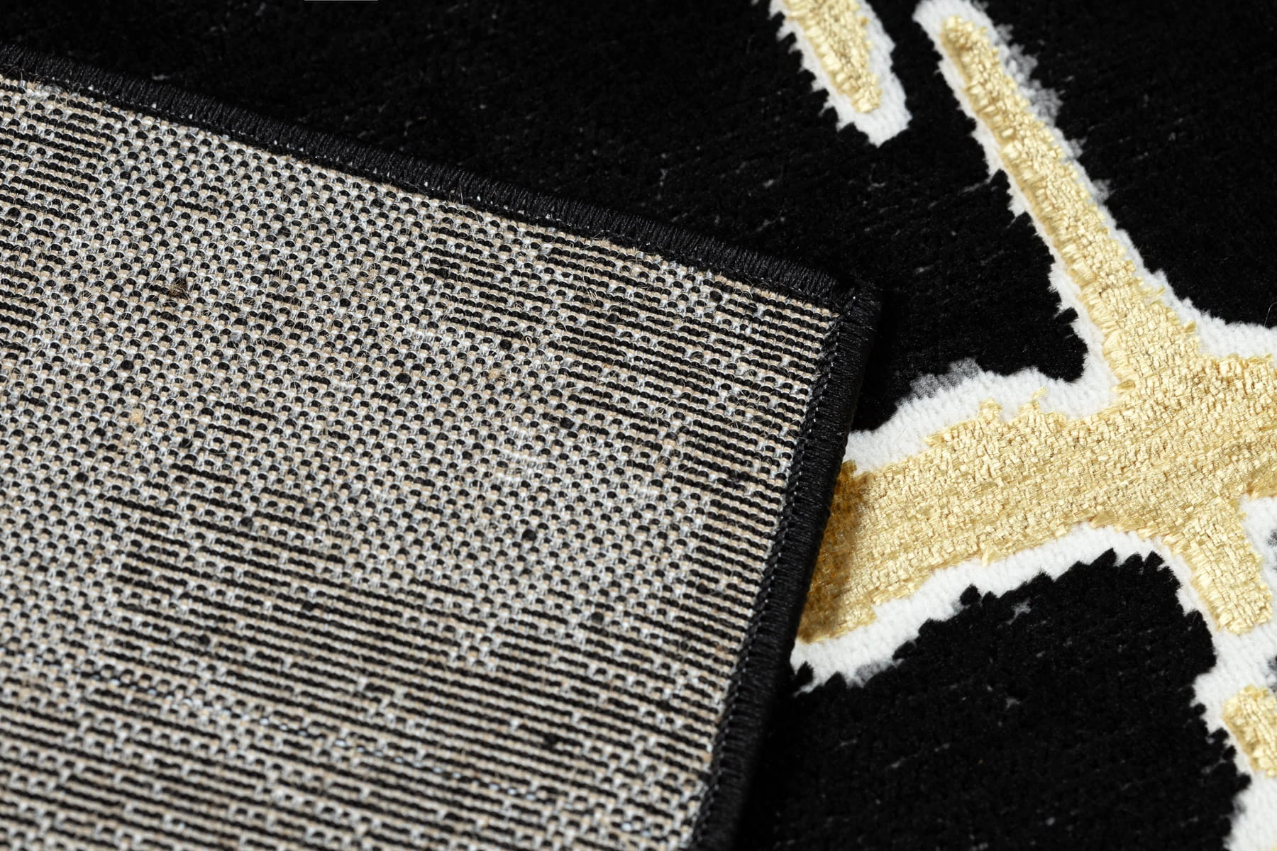 Czarno-złoty dywan z abstrakcyjnym wzorem, który nadaje salonowi elegancki i nowoczesny charakter.