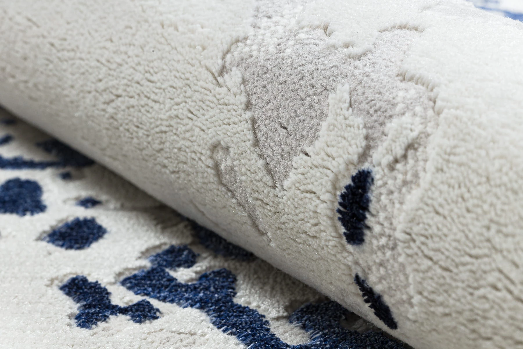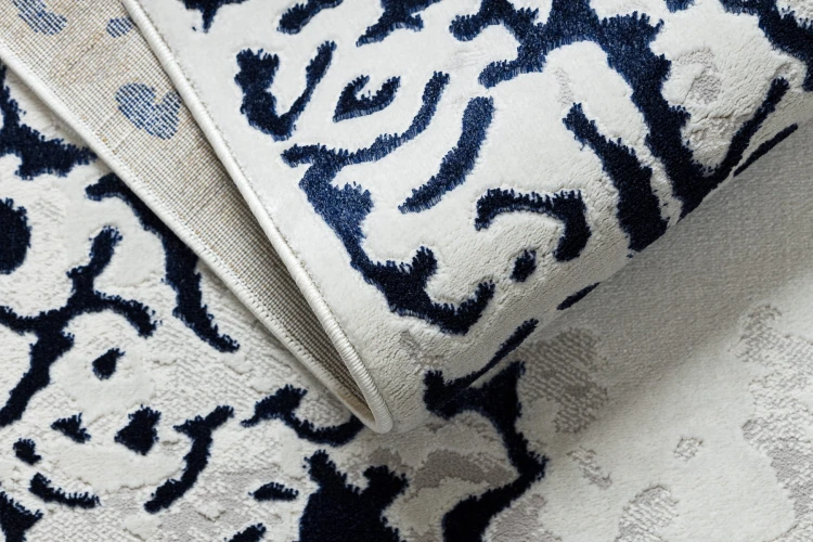 Biało-niebieski dywan z abstrakcyjnym wzorem, który doda salonowi świeżość i elegancki charakter.