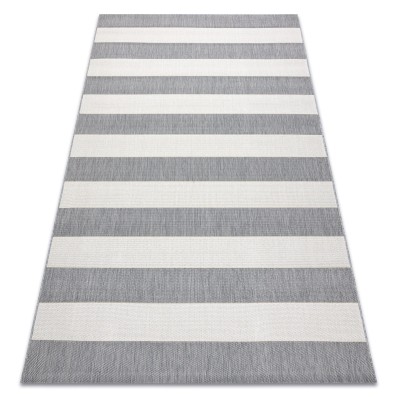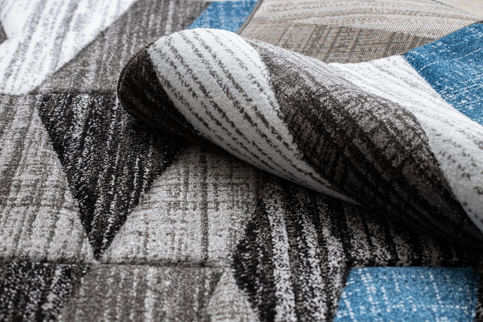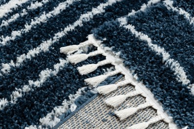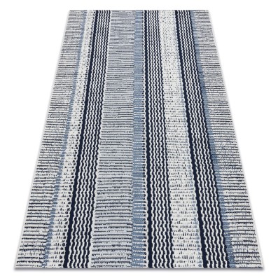 Niebieski dywan z geometrycznymi pasami, który wniesie do salonu lub pokoju świeży, nowoczesny akcent.