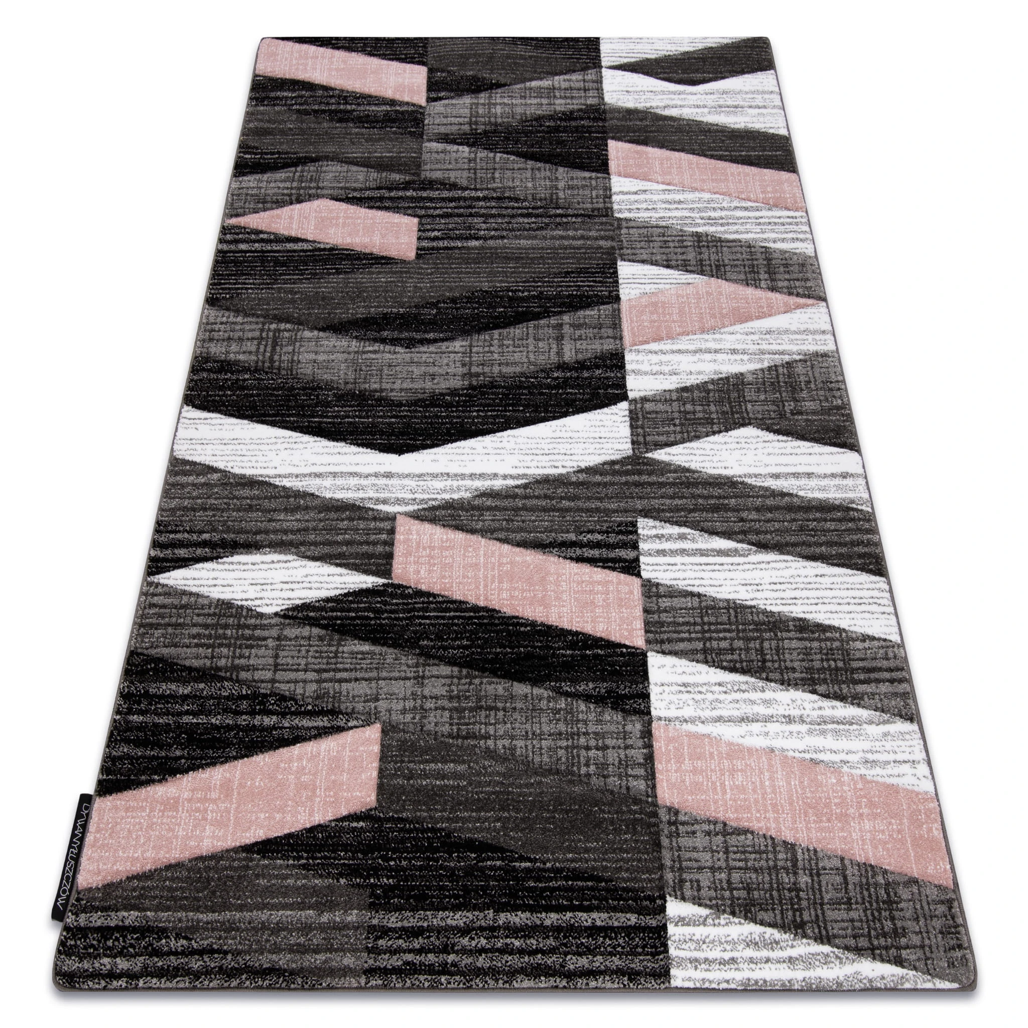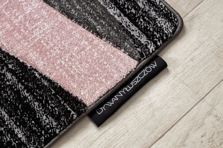 Różowy dywan z geometrycznym wzorem w pasy, który ożywi salon ciepłym, kobiecym akcentem.