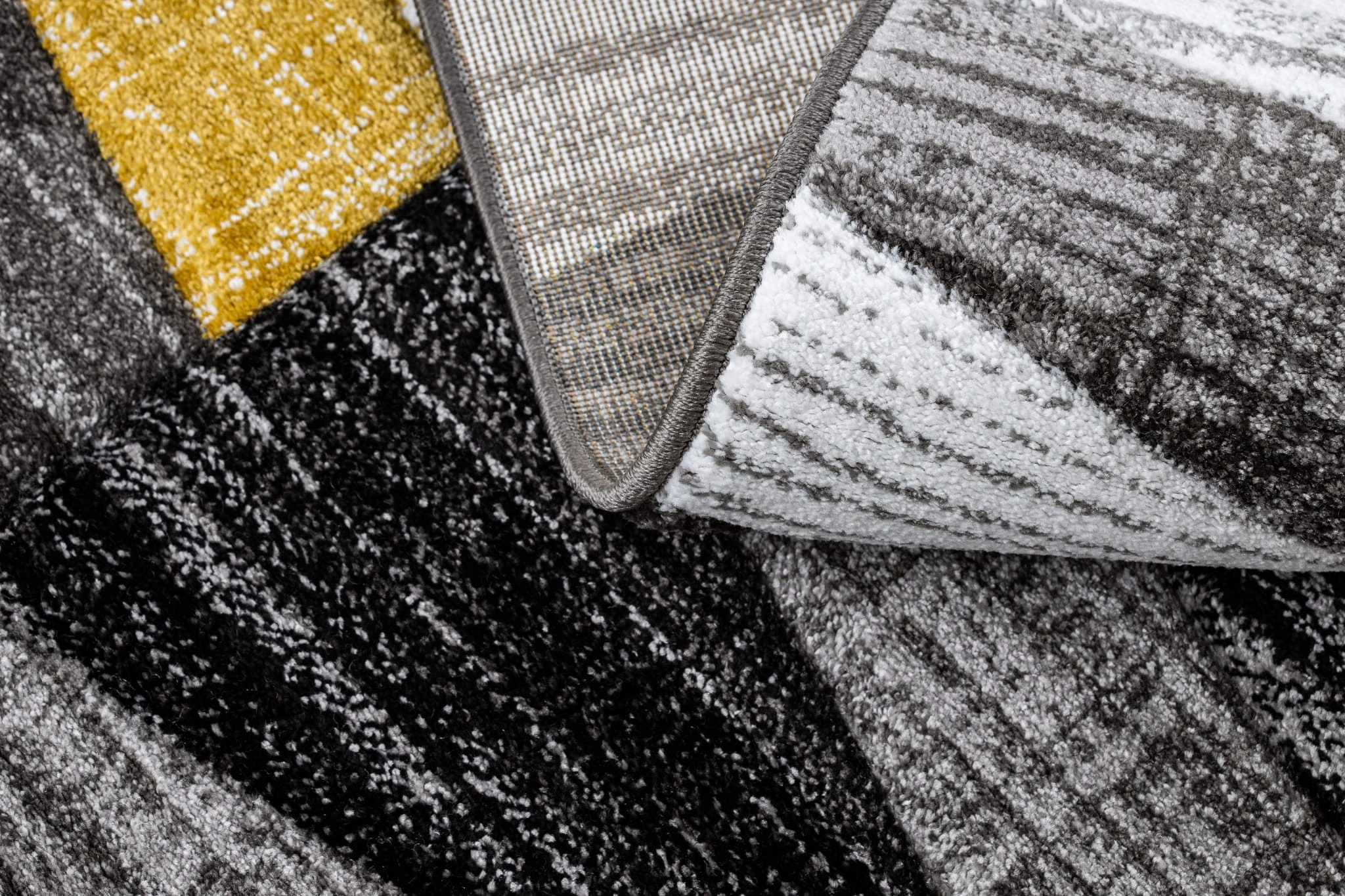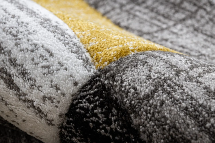 Złoty dywan z geometrycznym wzorem pasów, który rozjaśni korytarz ciepłym, eleganckim akcentem.