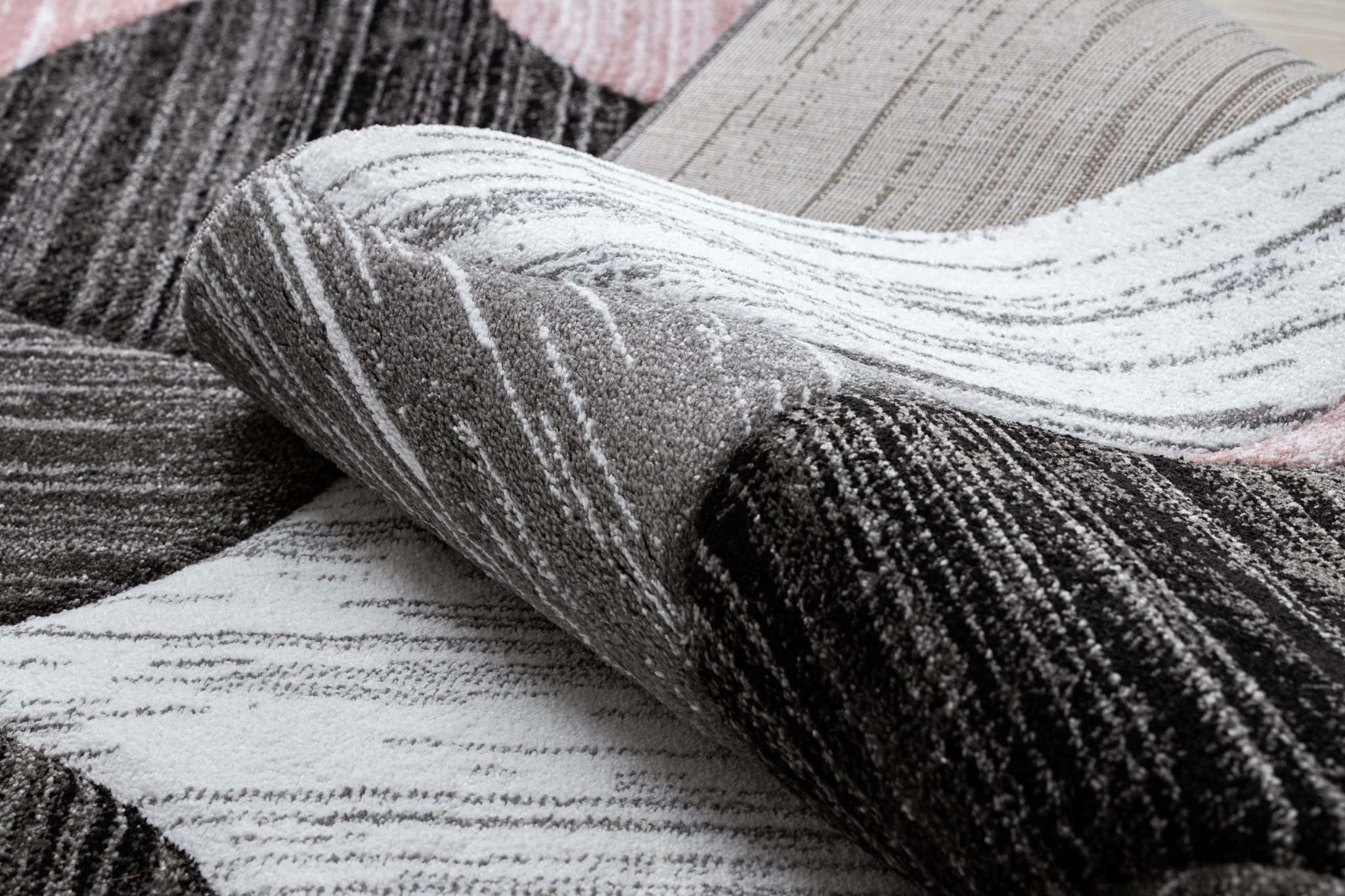 Różowy dywan z geometrycznym wzorem muszli, który wprowadzi do salonu subtelny, kobiecy akcent.