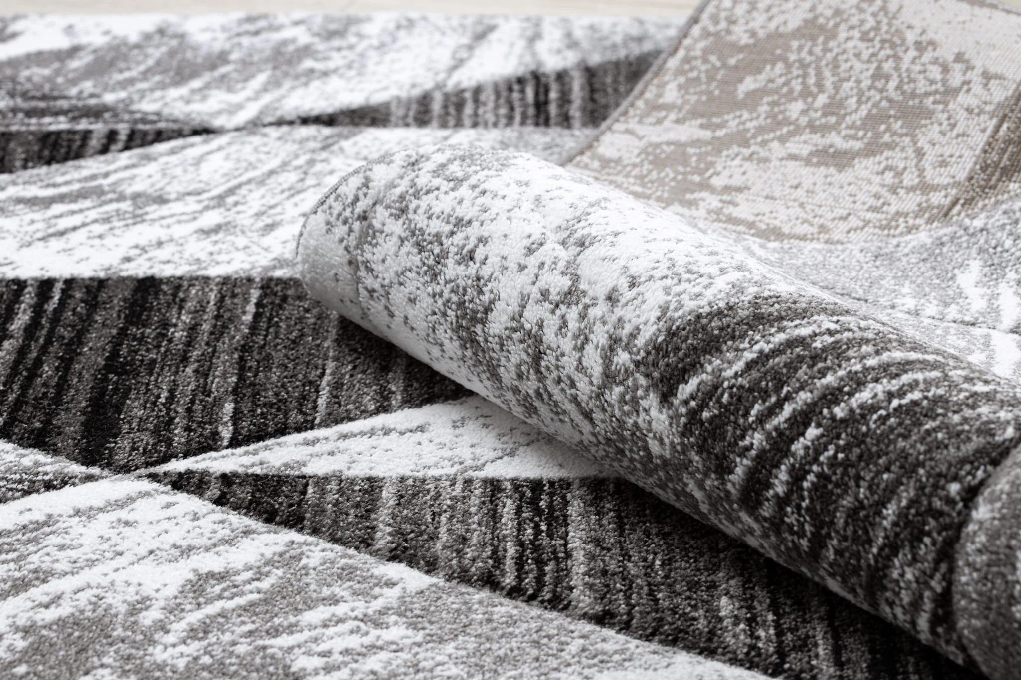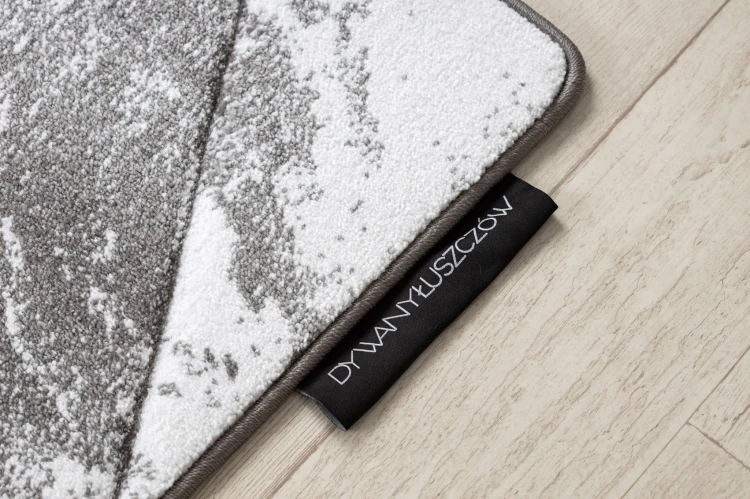 Szary dywan z geometrycznym wzorem trójkątów, który doda salonowi nowoczesny charakter.