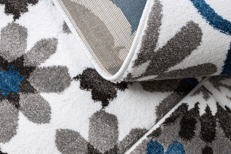 Niebieski dywan z delikatnym roślinnym motywem, który wniesie do salonu świeżość i naturalny charakter.