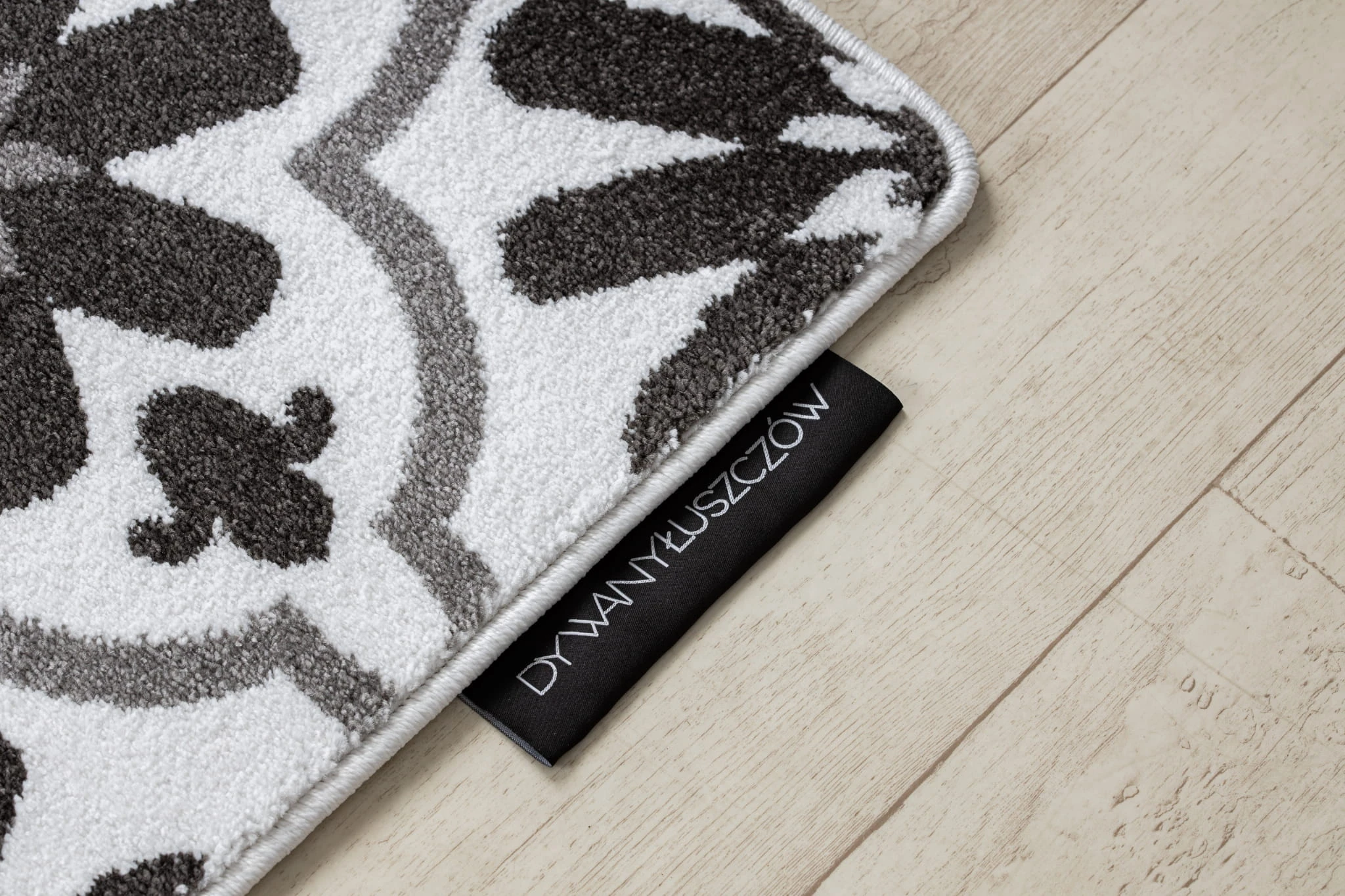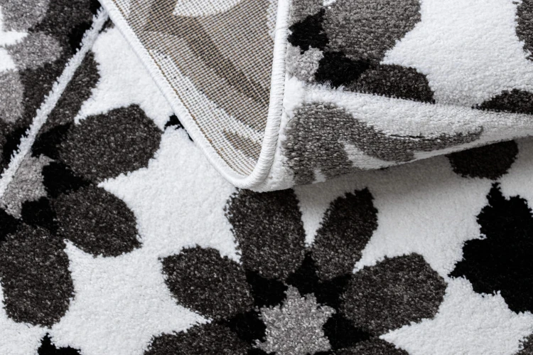 Szary dywan z delikatnym kwiatowym motywem, który wprowadzi do salonu lub pokoju naturalny charakter.