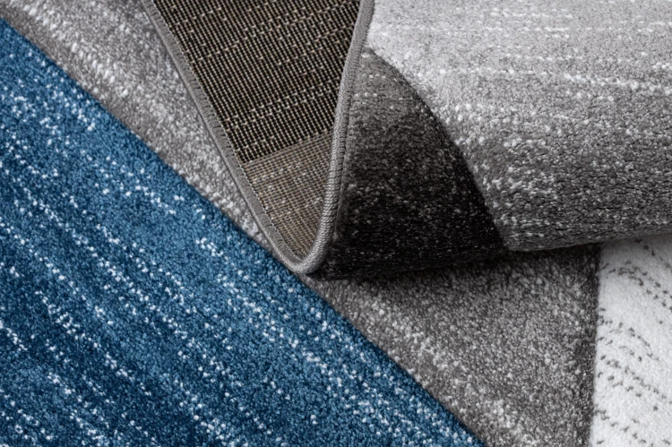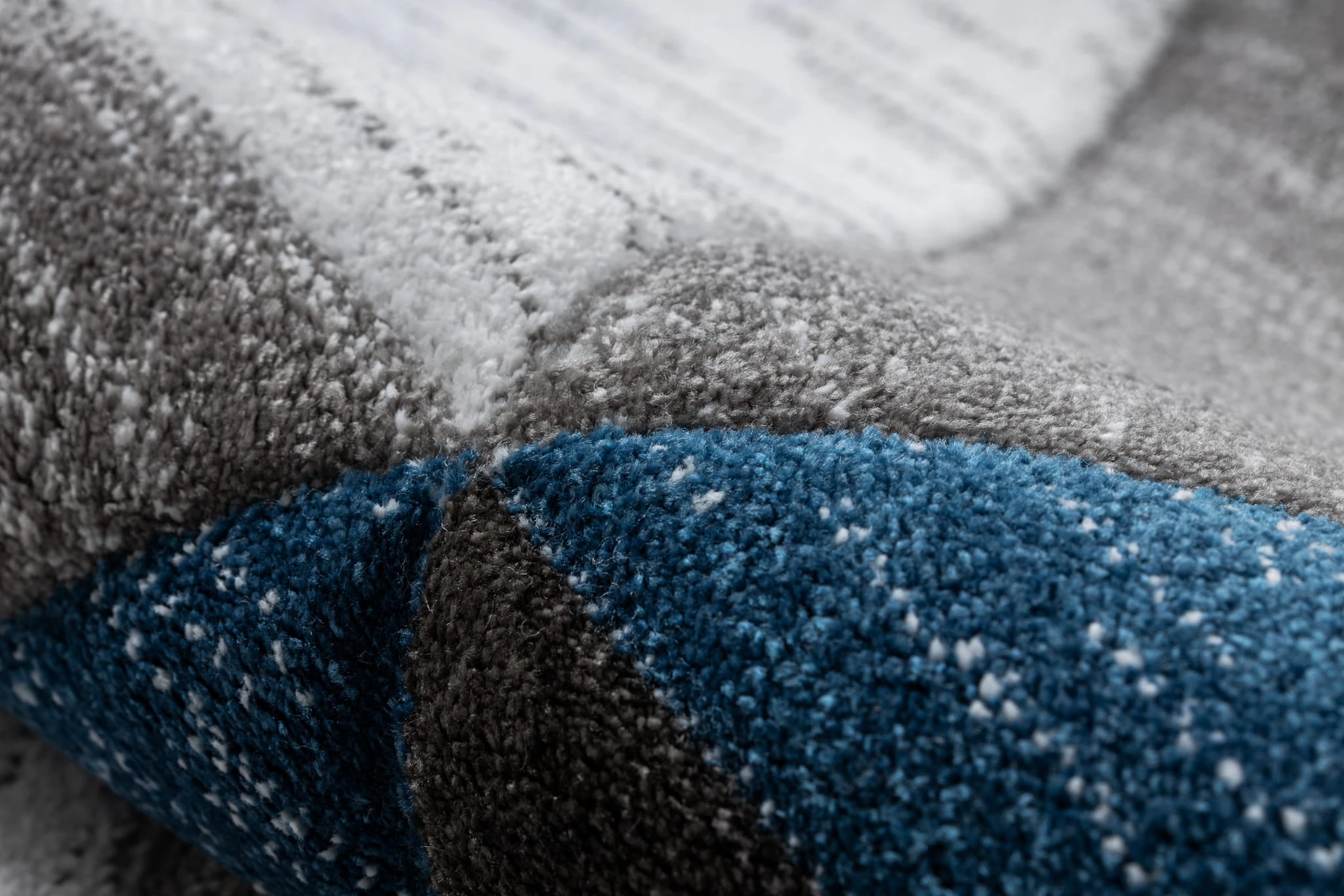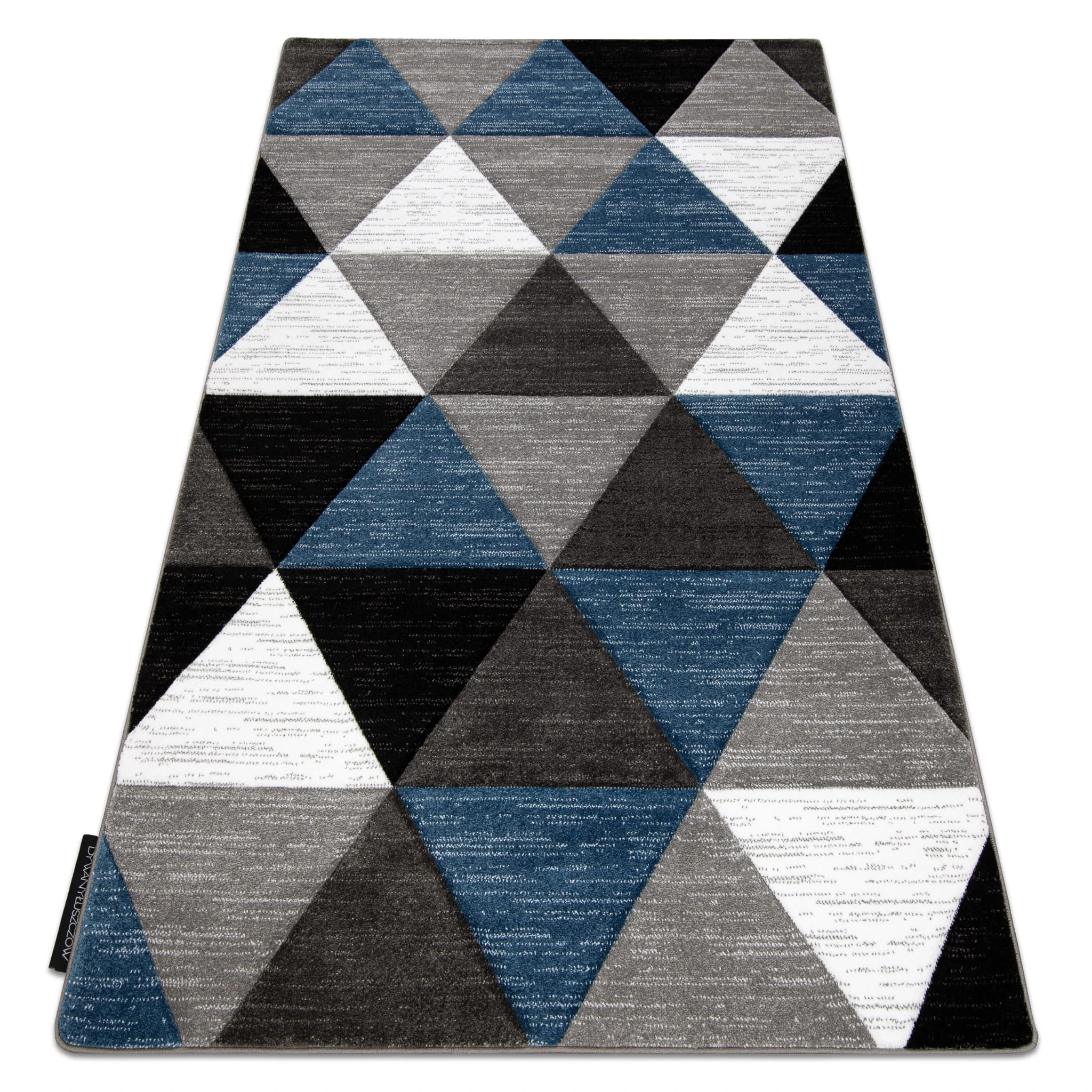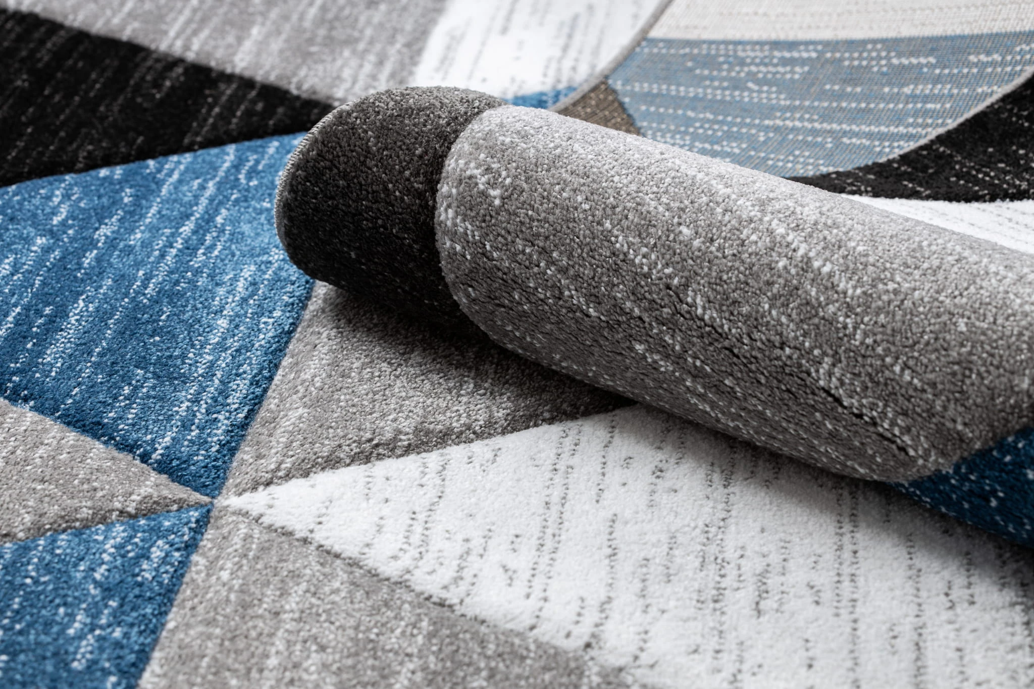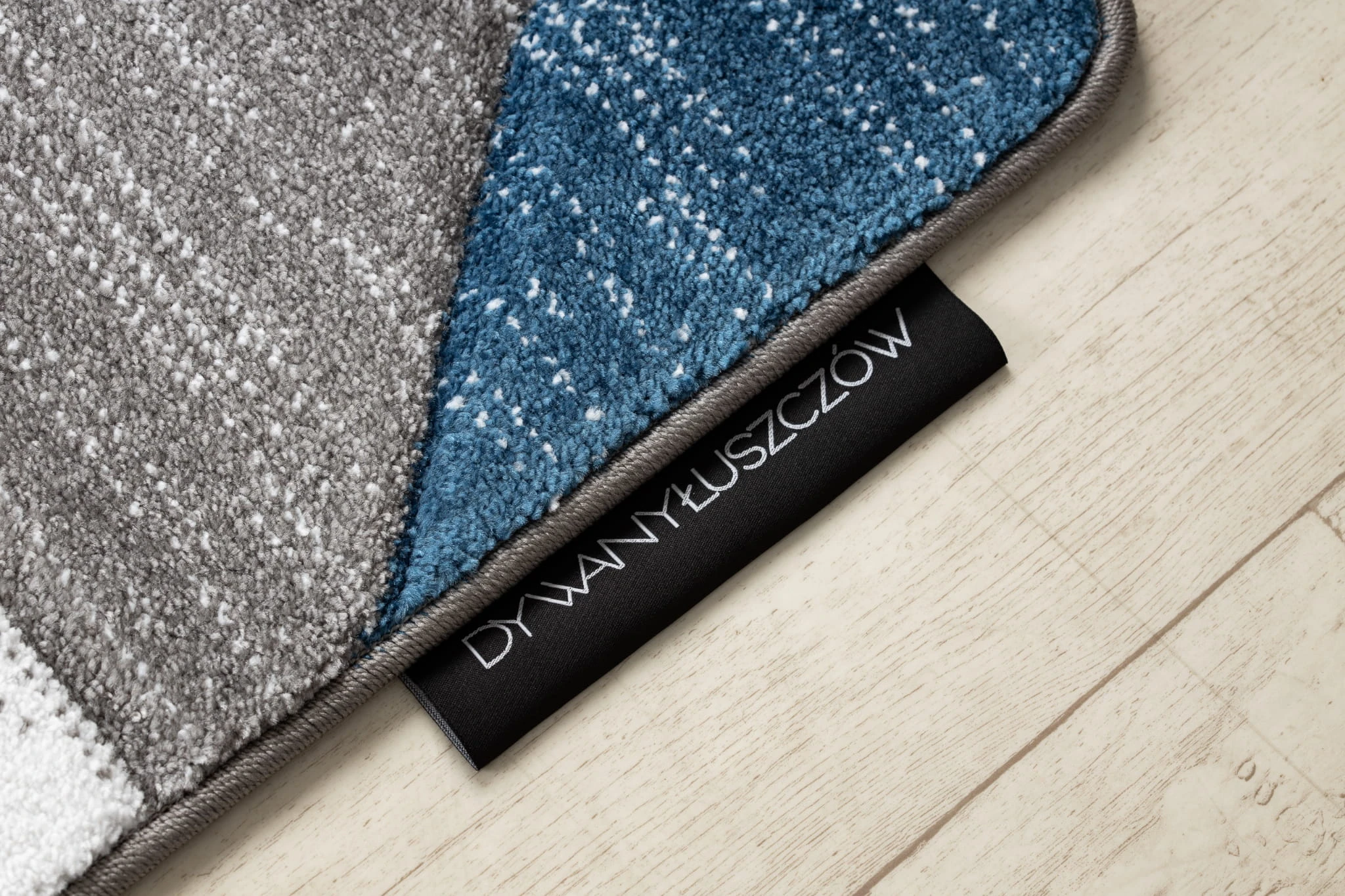 Niebieski dywan z geometrycznym wzorem trójkątów, który doda salonowi nowoczesny charakter i wyraziste akcenty kolorystyczne.