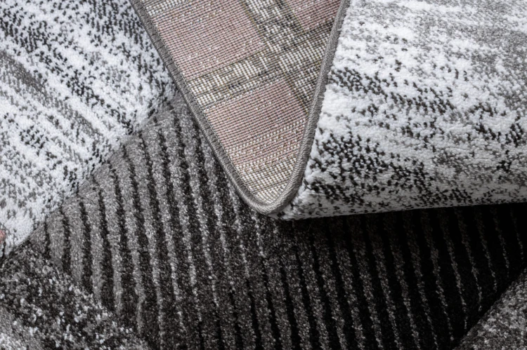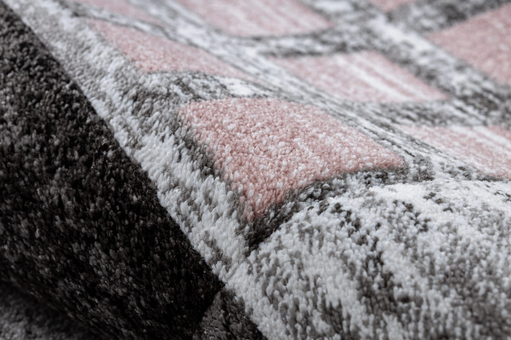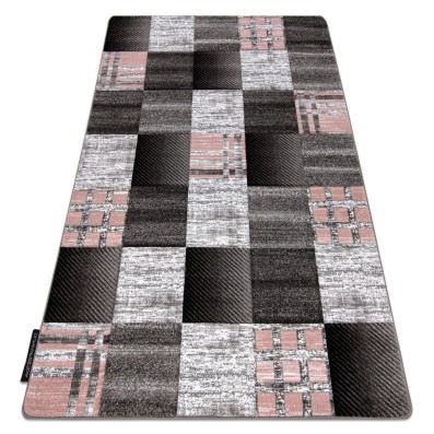 Szary dywan z geometrycznym wzorem kwadratów, który doskonale sprawdzi się w korytarzu, nadając mu nowoczesny charakter.