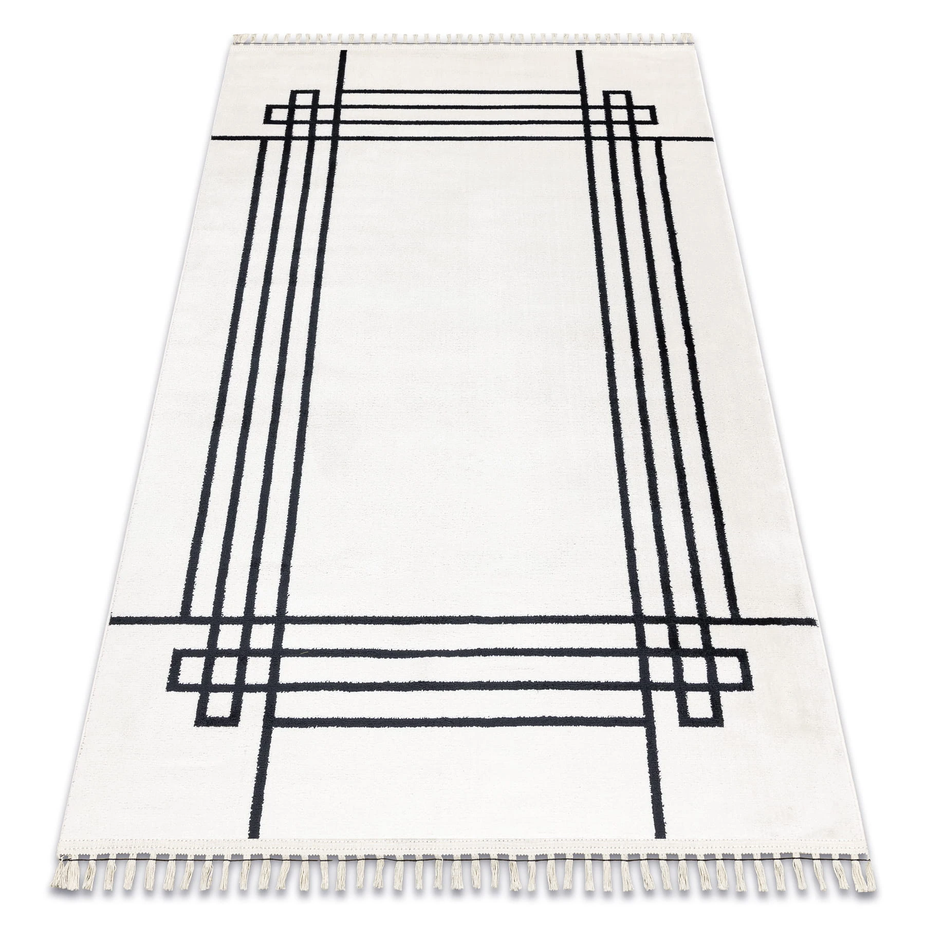 Kremowy dywan z geometryczną ramką, który doskonale wypełni korytarz, dodając mu eleganckiego charakteru.
