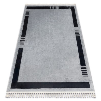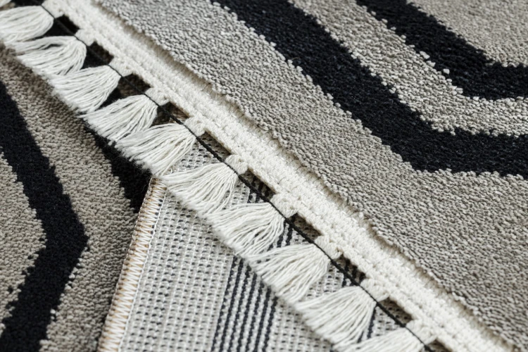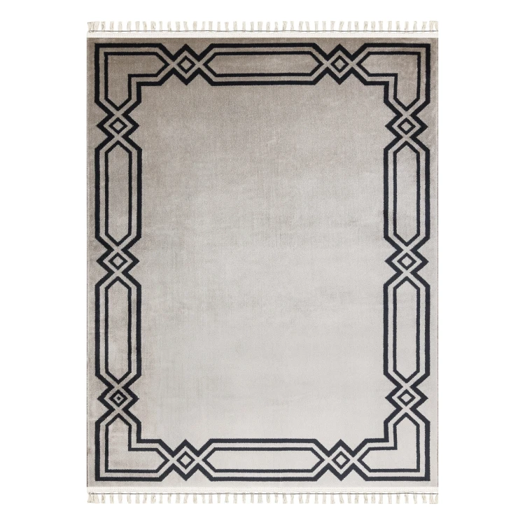 Beżowy dywan z delikatną ramką, który idealnie wypełni długi korytarz, dodając wnętrzu eleganckiego charakteru.