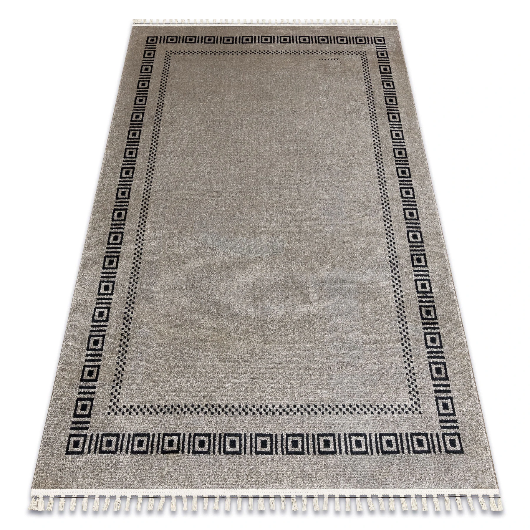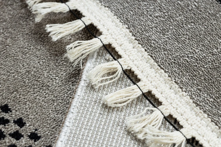 Beżowo-czarny dywan z elegancką ramką, który doskonale wpisze się w salon lub pokój, dodając wnętrzu klasycznego charakteru.