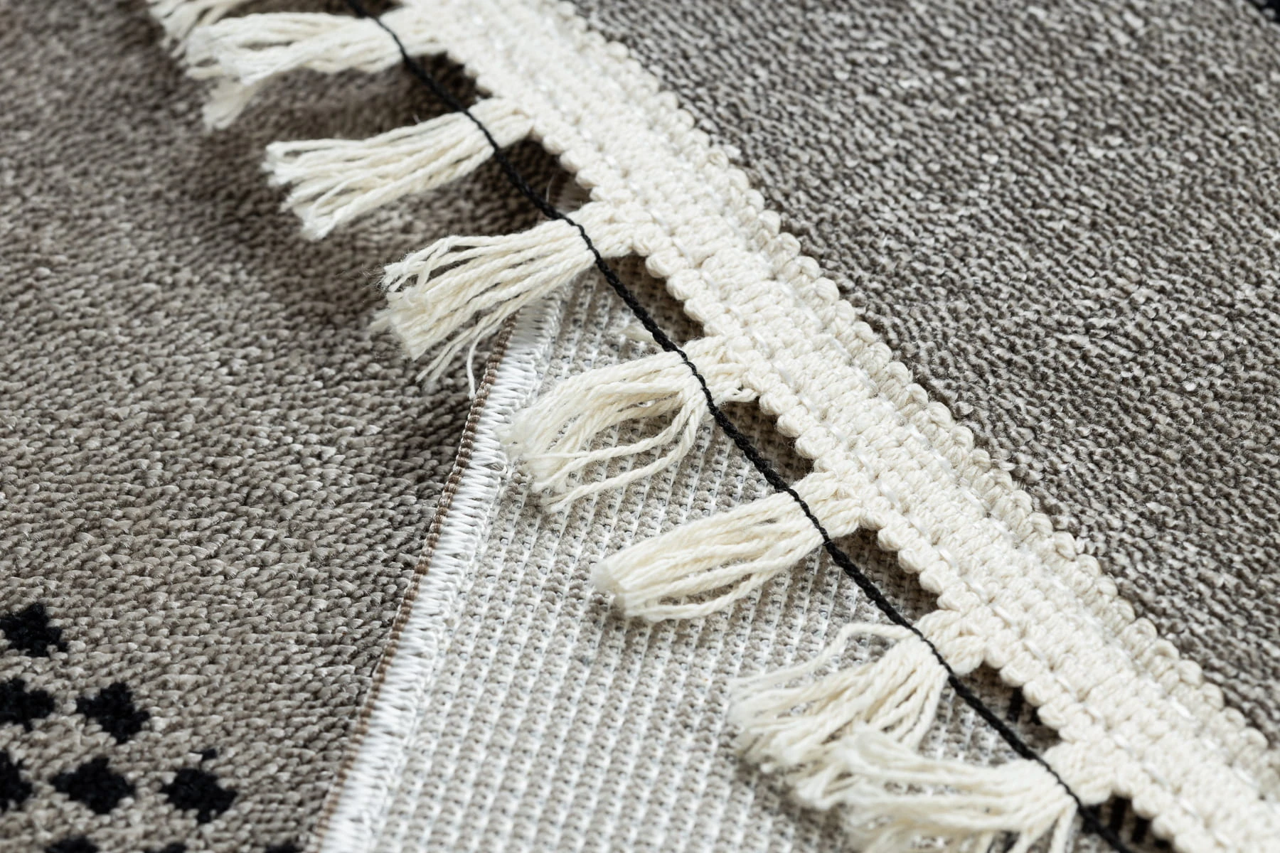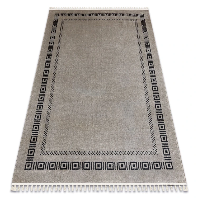 Prostokątny dywan w odcieniach beżu i czerni z subtelną ramką, który idealnie wypełni korytarz stonowaną elegancją.
