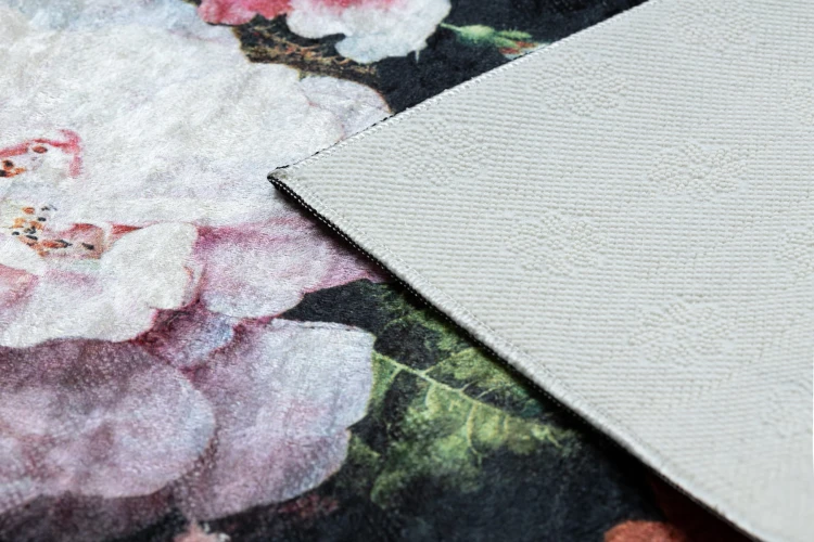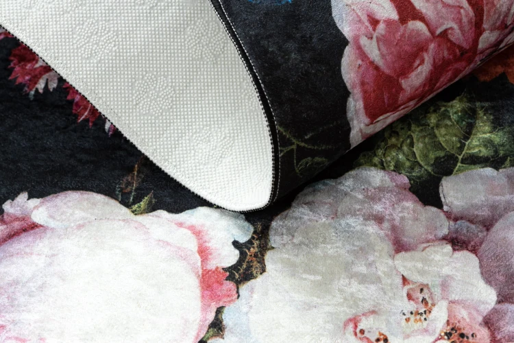 Różowy dywan z kwiatowym wzorem na czarnym tle, który ożywi korytarz eleganckim, kobiecym akcentem.