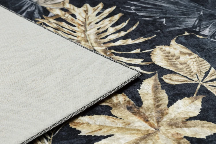 Czarno-złoty dywan z egzotycznym wzorem liści Monstery, który wprowadzi do salonu naturalny i elegancki akcent.
