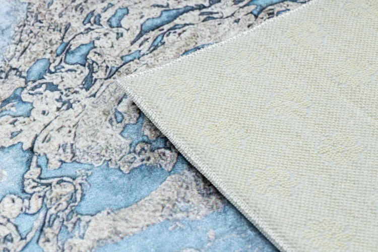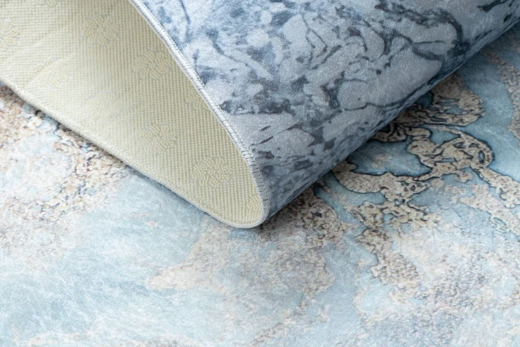 Niebieski dywan z abstrakcyjnym wzorem marmurkowym, który wprowadzi do salonu lub pokoju elegancki, naturalny akcent.