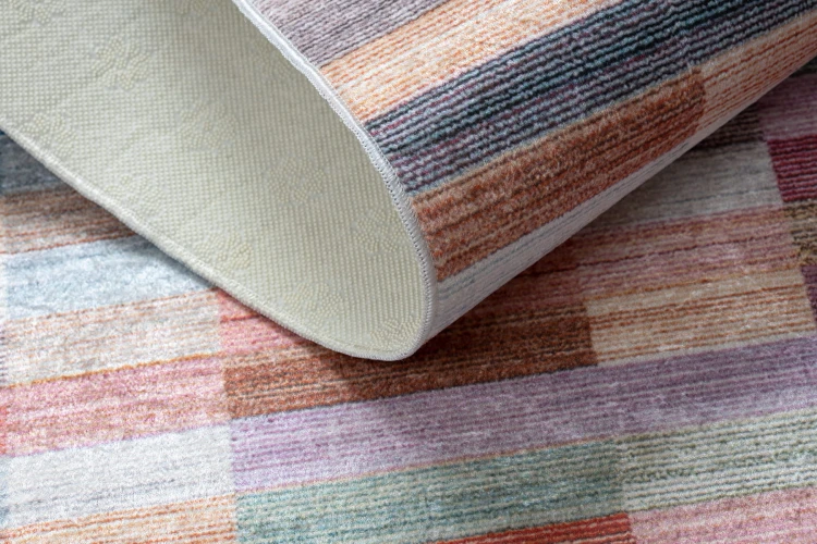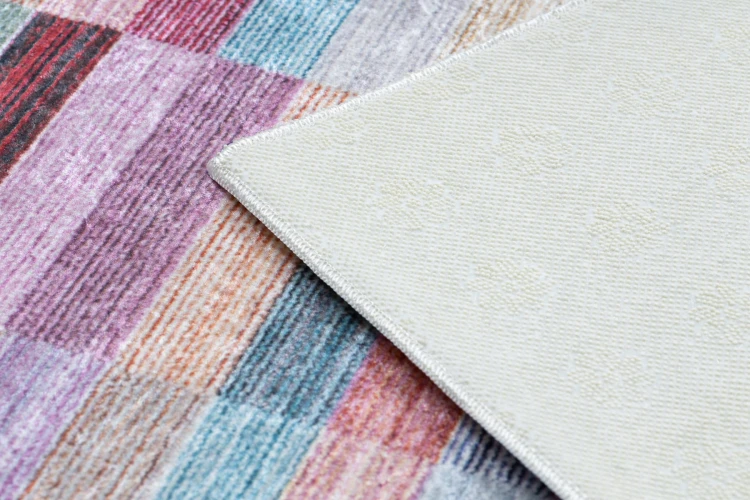 Różowy dywan z geometrycznymi pasami, który wprowadzi do salonu lub pokoju świeży, kolorowy akcent.
