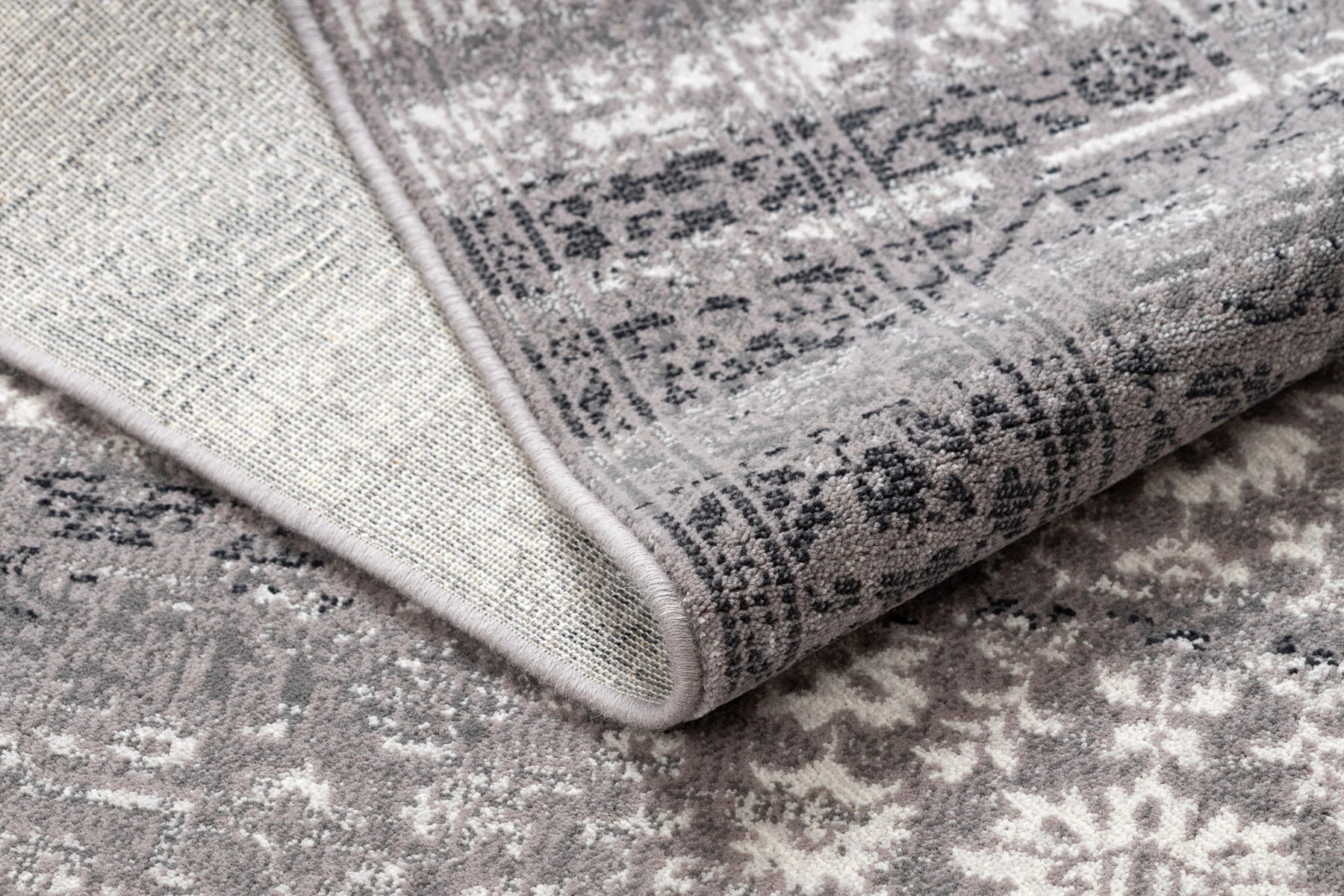 Szary dywan z wełny z abstrakcyjnym wzorem rozety, który doda korytarzowi elegancki charakter w stonowanym stylu.