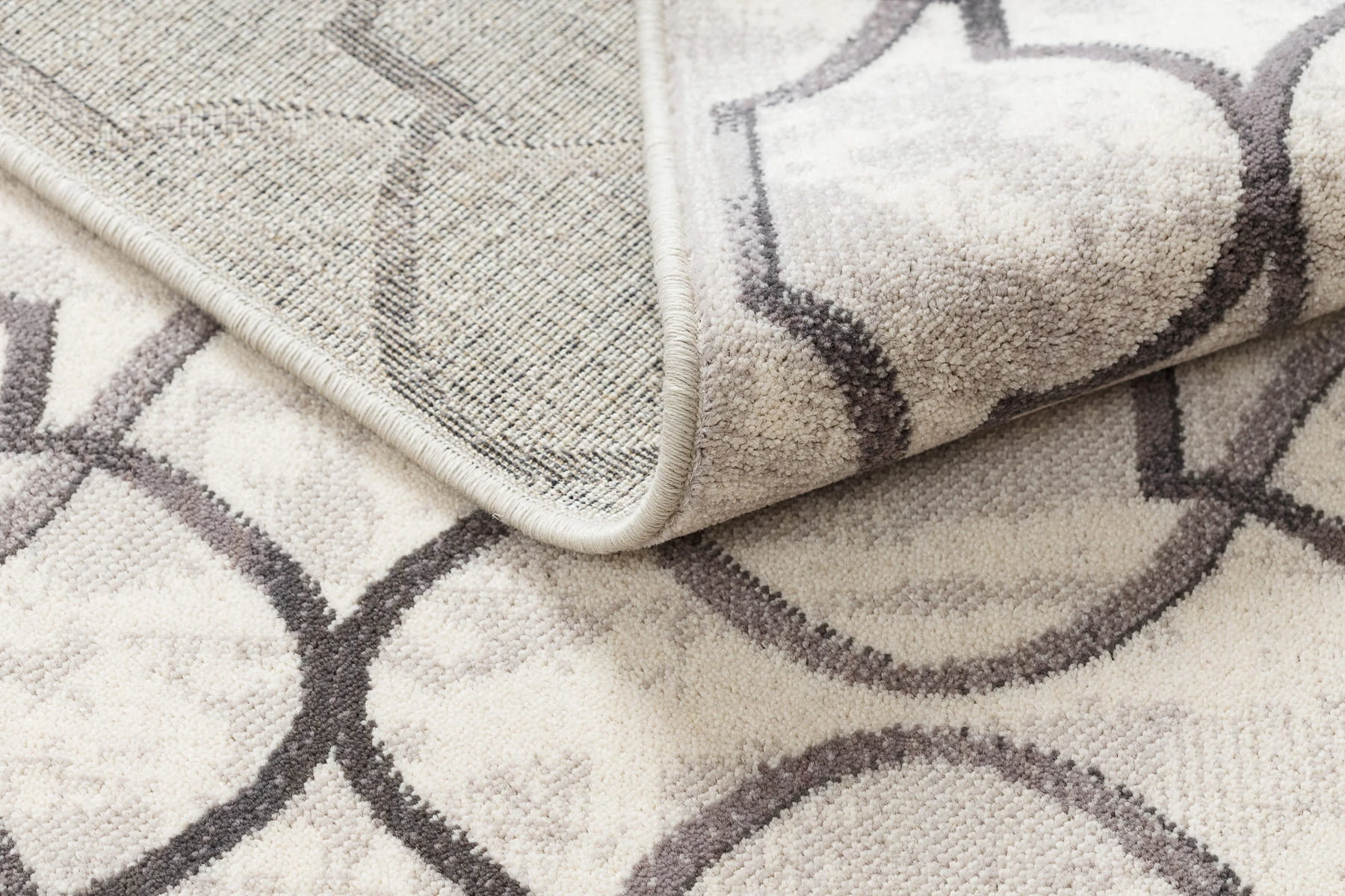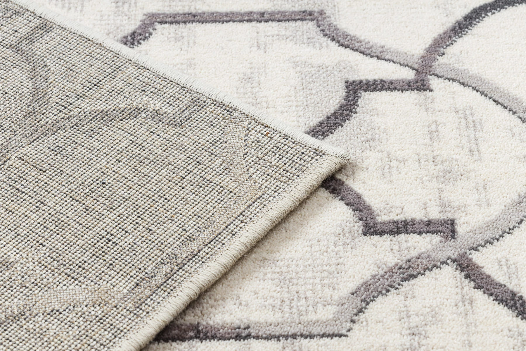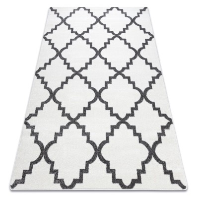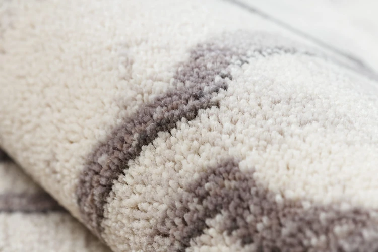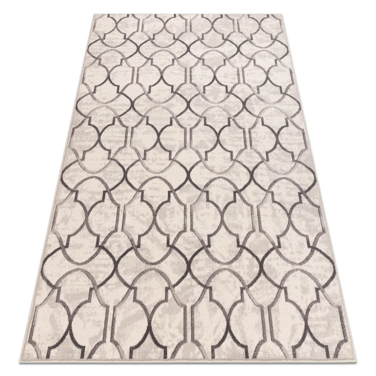 Beżowy dywan z geometrycznym wzorem marokańskiej koniczyny, który doskonale sprawdzi się w korytarzu, nadając mu elegancki charakter.