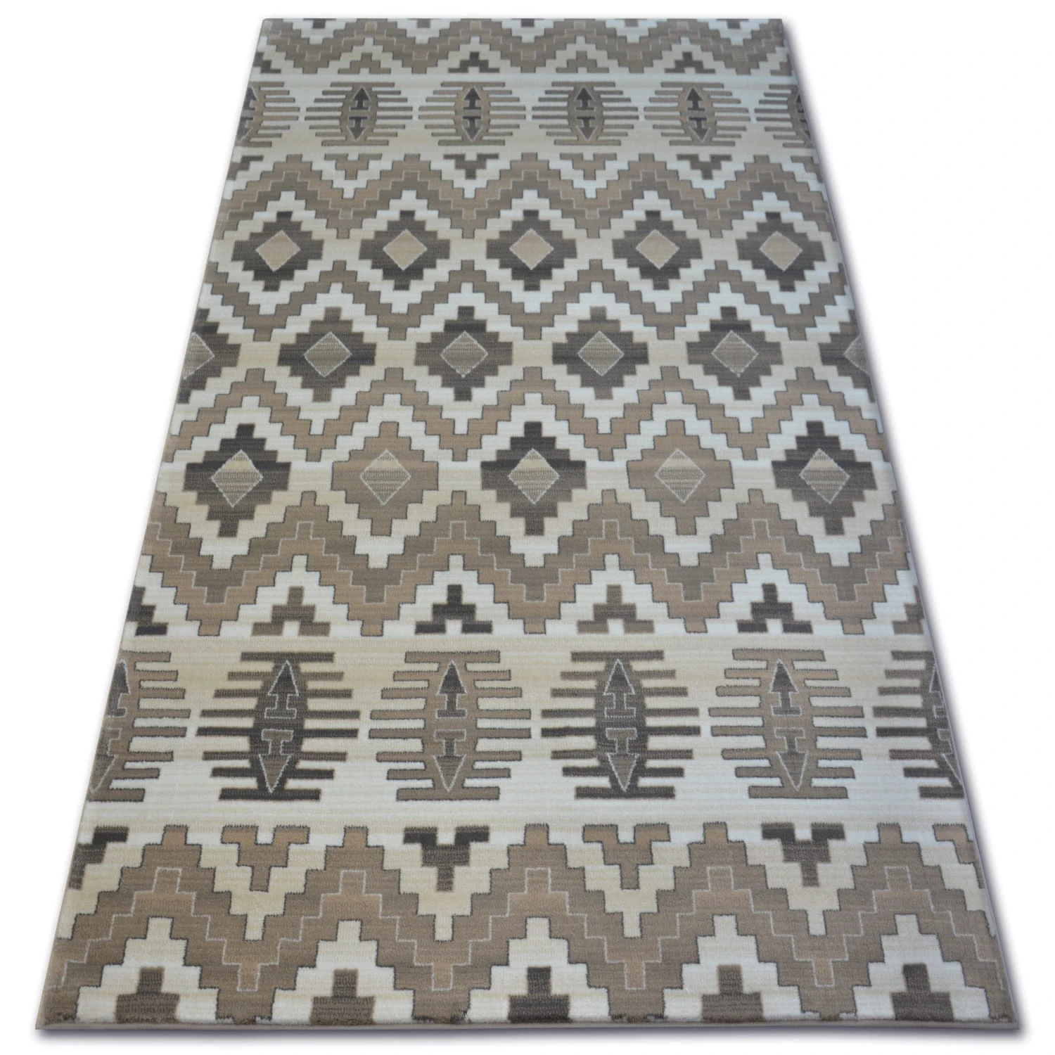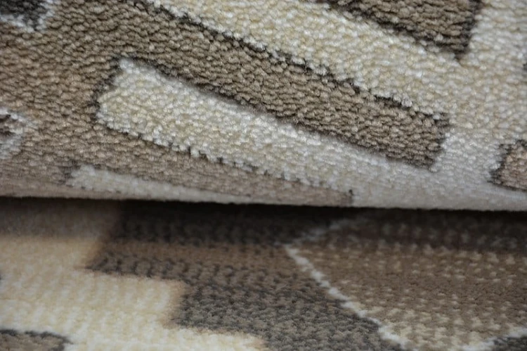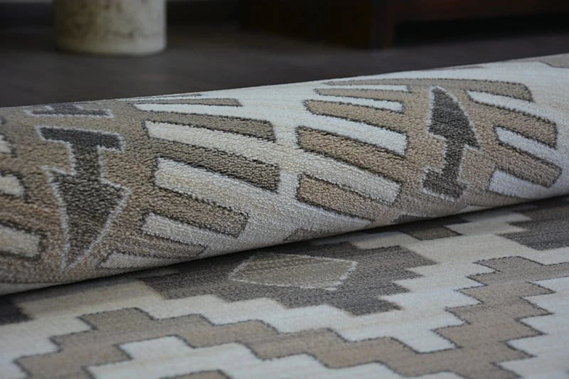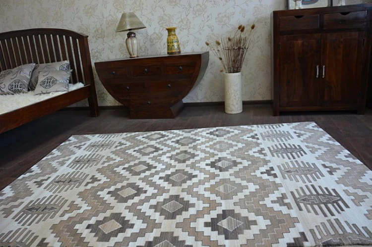 Beżowy dywan z geometrycznym wzorem rombów, który doda salonowi subtelnego charakteru i harmonijnie wpisze się w nowoczesne wnętrza.