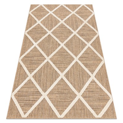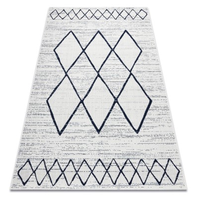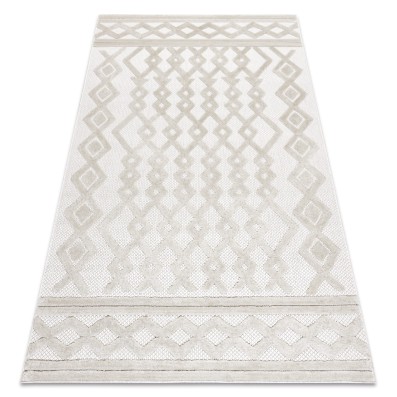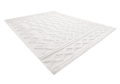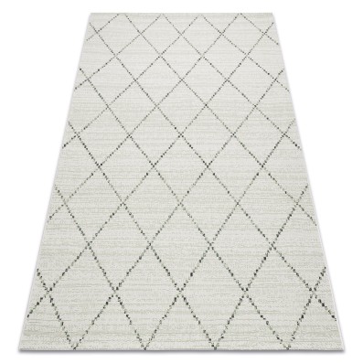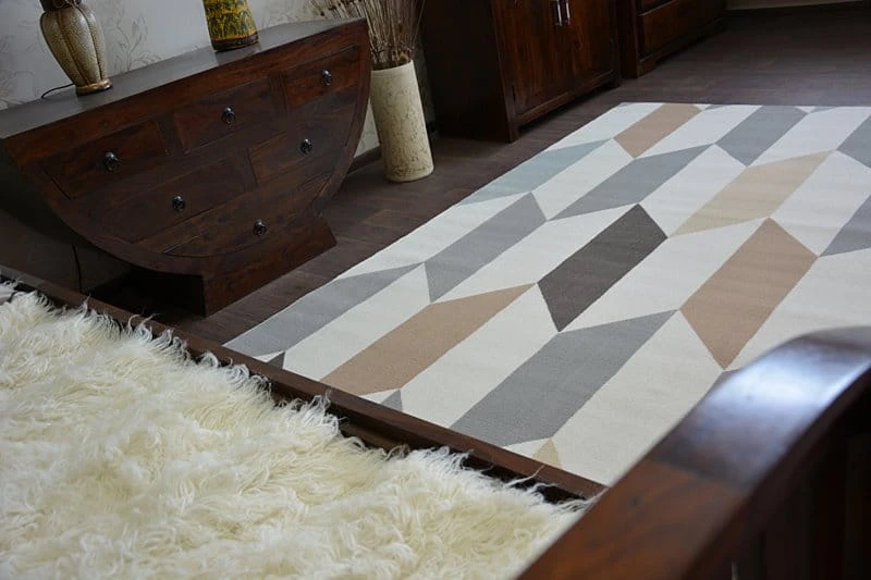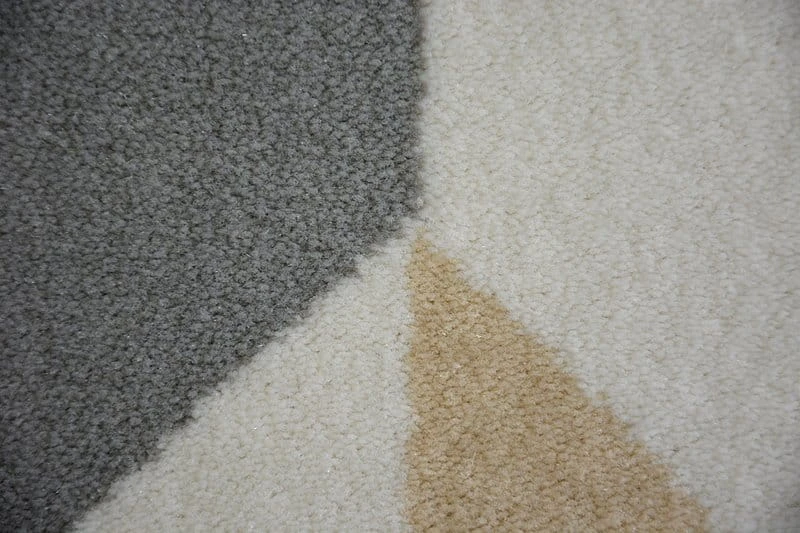 Kremowy dywan z geometrycznym wzorem rombów, który doda salonowi nowoczesny charakter i rozjaśni wnętrze.
